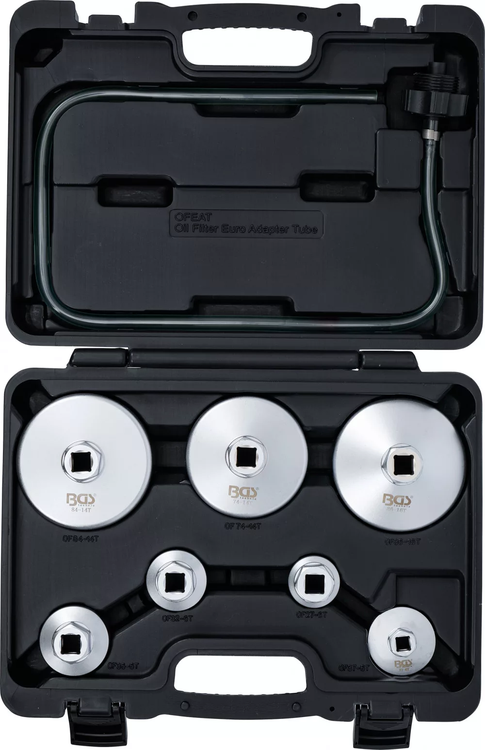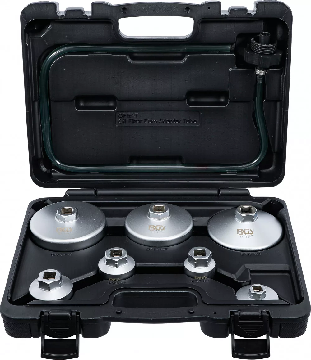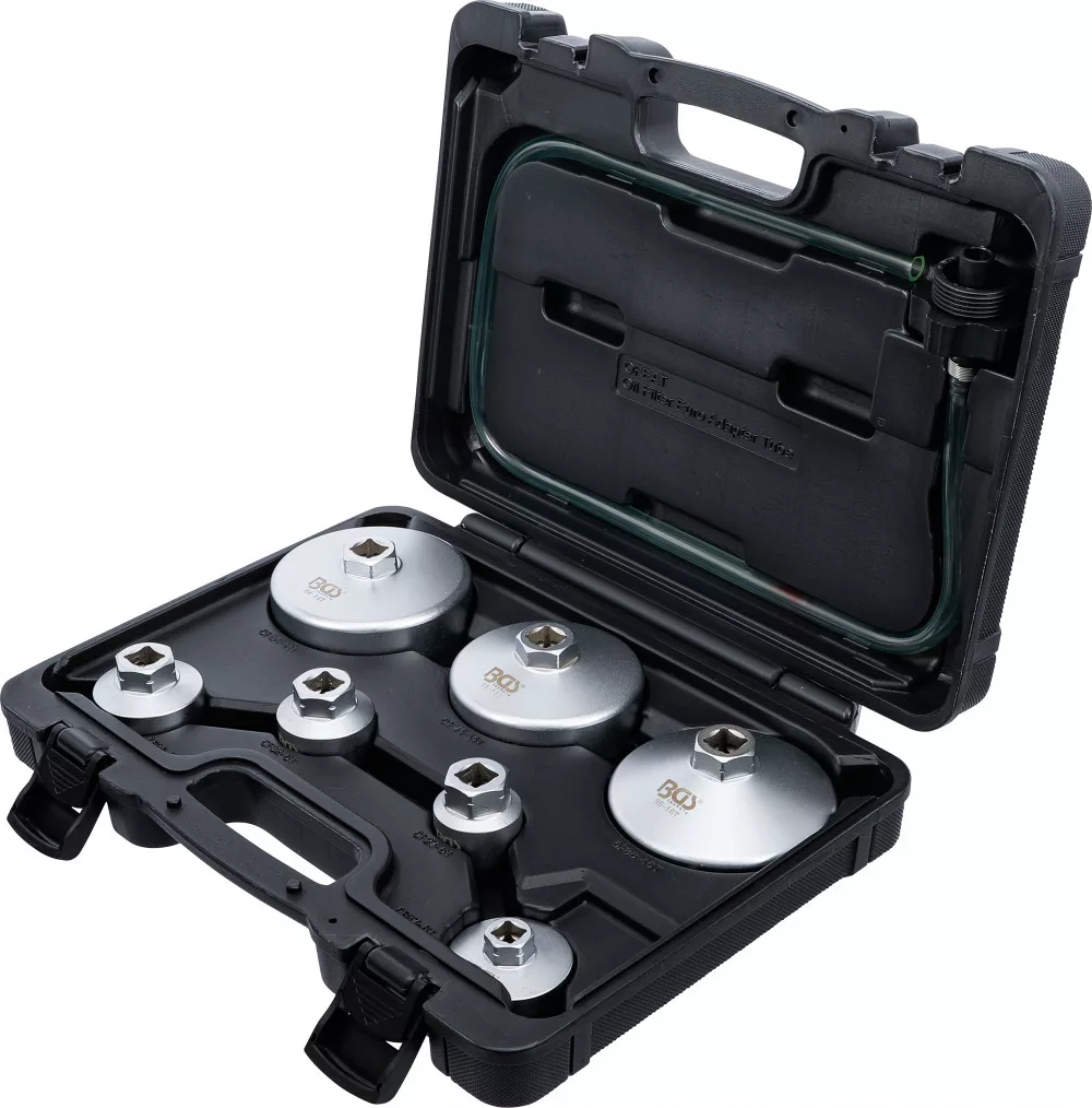 BGS technic Olajszűrőkulcs készlet leeresztő tömlővel, VAG, BMW, Citroën, Peugeot, Ford, Mercedes-Benz, Opel, Volvo, 8 darabos (BGS 72054)