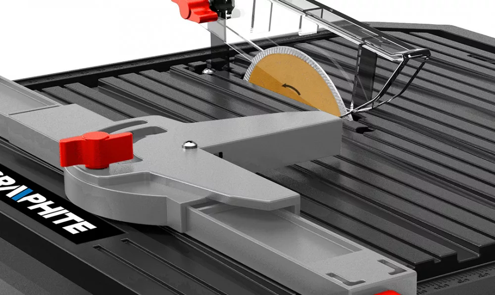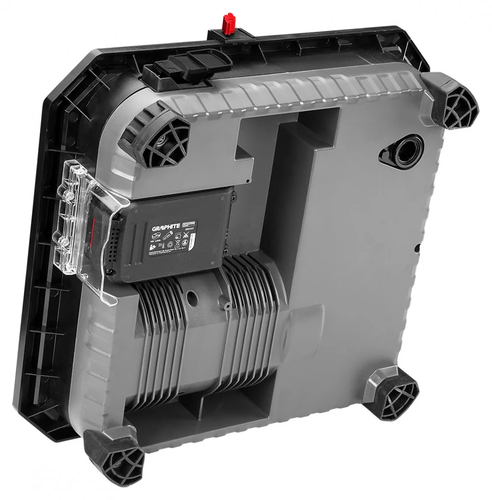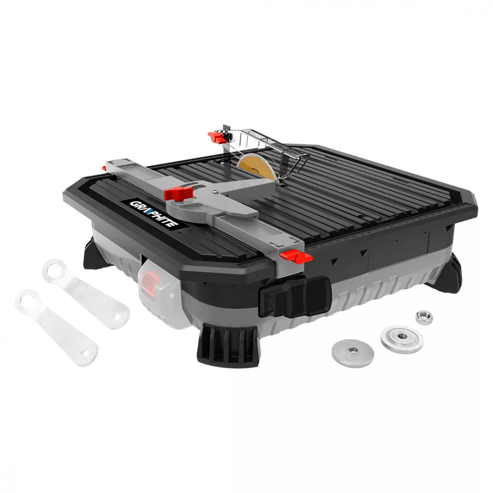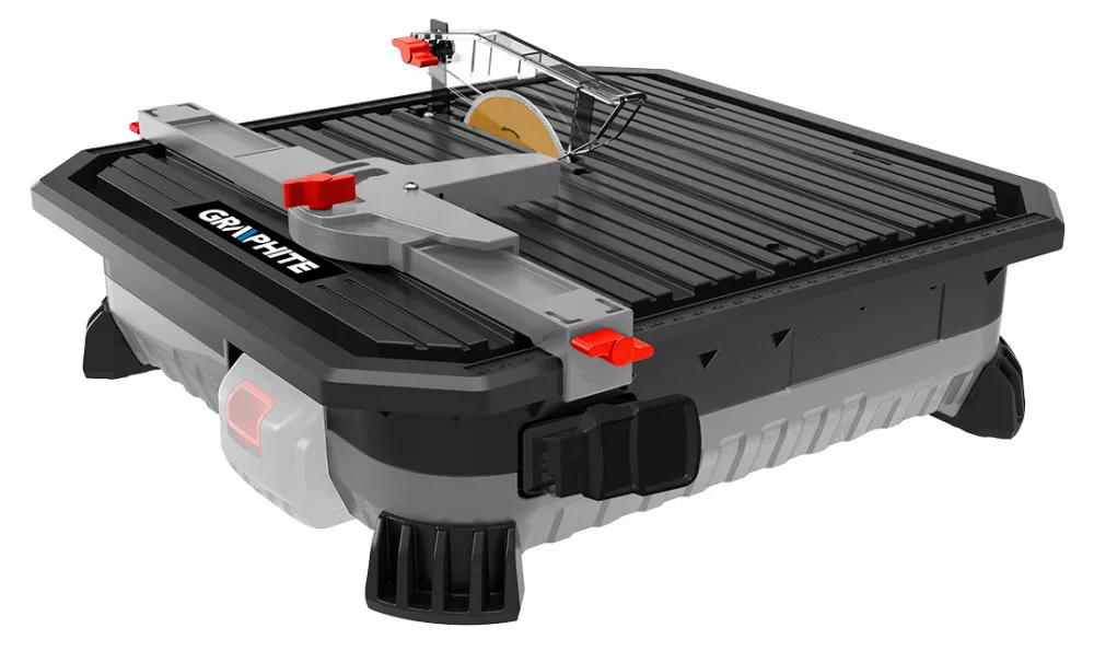 GRAPHITE akkus csempevágó,18V Li-ion. Energy+ akkumulátorokkal kompatibilis. Ajánlott akkumulátorok 2 Ah (23 perc munkaidő), 4 Ah (45 perc munkaidő) és 6 Ah (65 perc munkaidő) kapacitással. A vágógép 110 x 7 x 22,2 mm-es gyémánttárcsával van felszerelve. A maximális vágási mélység 24 mm (90 fokban) és 16 mm (45 fokban). A beépített víztartály biztosítja, hogy vágás közben nem keletkezik por, mint egy normál sarokcsiszolónál. A vágógép precíz munkavégzést biztosít. Kompakt méretei (munkafelület - 370x390x112 mm) és kis súlya miatt könnyen szállítható. ABS anyagból készült. A készlethez hosszirányú vezető, szögmérő szögmérő szögmérővel, pengevédő és kulcsok (2 db) is tartoznak. Szakembereknek és haladó barkácsolóknak ajánlott.