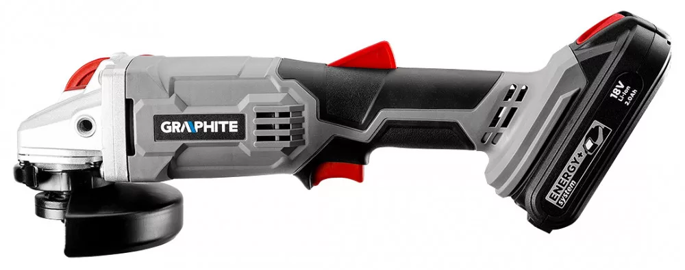 GRAPHITE akkus sarokcsiszoló , 18V Li-Ion. GRAPHITE Energy+ akkumulátorokkal kompatibilis. A 115 mm átmérőjű tárcsákkal használható, eléri a percenkénti 10000 fordulatot. A csiszoló reteszes kapcsoló gombbal rendelkezik, ami garantálja a biztonságot. Az elektromos szerszám felépítése kimagaslóan ergonomikus - a vékonyabb markolati rész csúszásmentes műanyaggal került bevonásra, melynek köszönhetően a gép biztosan fekszik a kézben. Az áttétel lapos házának köszönhetően a berendezés nehezen hozzáférhető helyeken is használható. A burkolt tengelyretesz óvja a felhasználót a retesz véletlen bekapcsolásától az üzem közben. A szellőzőnyílások a markolat zónáján kívül esnek, ami óvja a motort a túlmelegedéstől. A tárcsa védőlemezének állítása szerszámok nélkül történik.