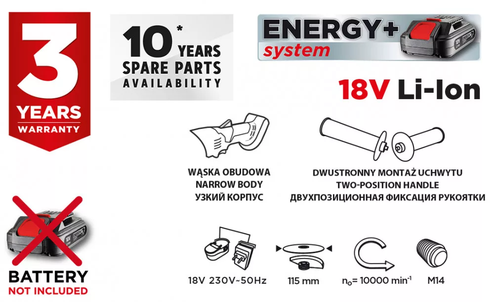 Akkus sarokcsiszoló 18V, Li-Ion, 115x22.2 mm tárcsa, fordulatszám 10000 min⁻¹, orsó menet M14, kétállású oldalsó markolat, (LxH) 320 x 130 mm, tömege 1.5 kg, kompatibilis az Energy+ akkumulátorokkal
