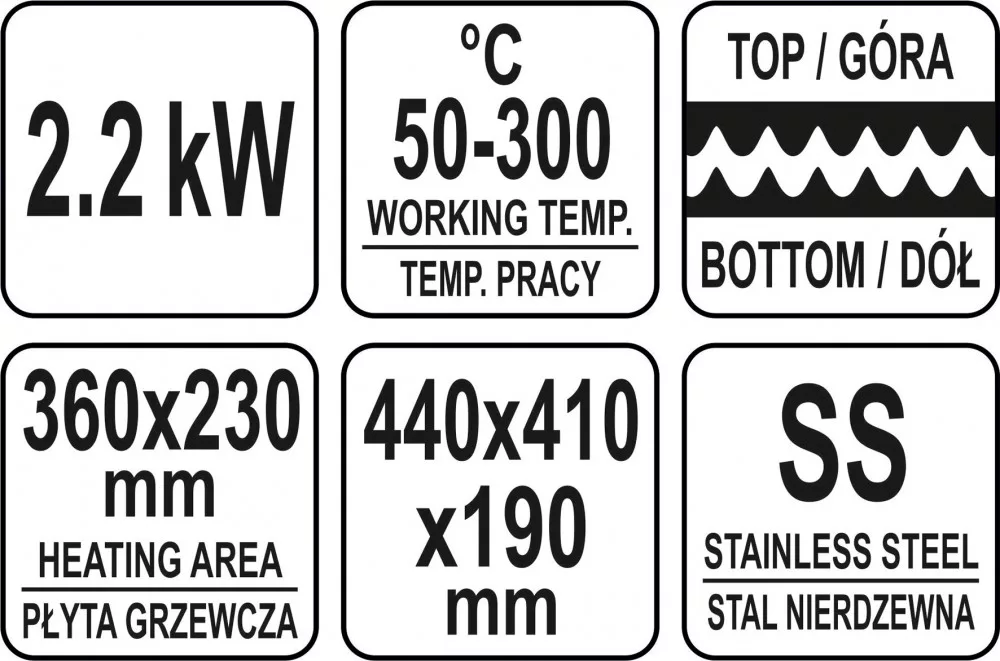 A 2,2 kW-os fűtőberendezést az előlapon található potenciométer vezérli. Az üzemi hőmérsékletet 50 ~ 300 ℃ tartományban lehet beállítani. A beépített fröccsenésbiztos kapcsoló lehetővé teszi, hogy a grill használaton kívül kikapcsolható legyen anélkül, hogy a hálózati kábelt le kellene választani a hálózatról. A grill 230V~50Hz-es tápfeszültséggel működik.