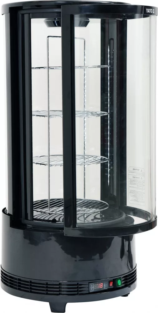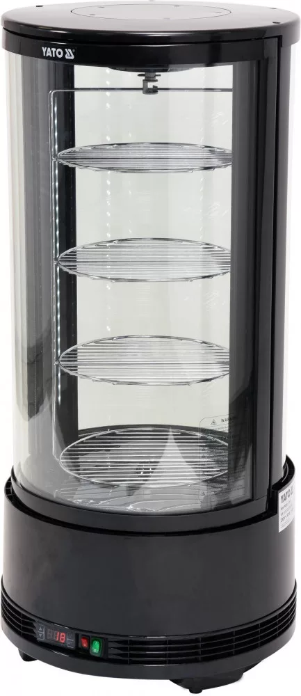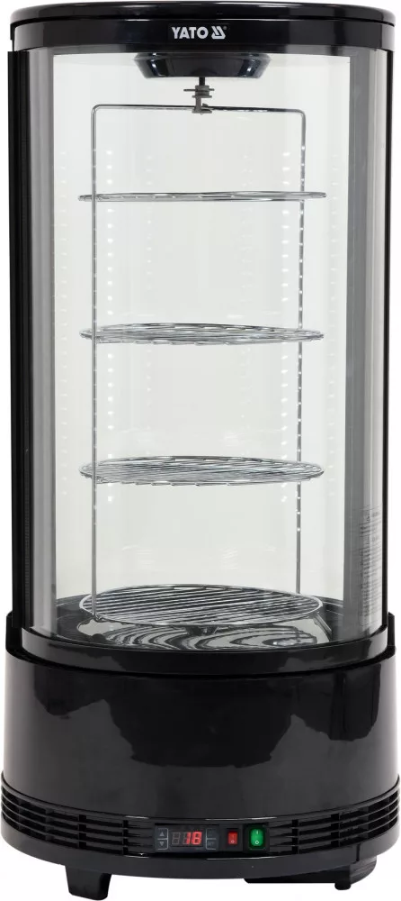 YATO állítható kerek hűtött vitrines pult 73 literes kapacitással fekete színben. A YG-05090 modell forgó polcokkal van felszerelve, amelyek forgását egy külön kapcsolóval lehet be- és kikapcsolni. A YATO hűtött vitrines pultot sütemények, torták, koktélok vagy különféle italok bemutatására tervezték. A modern design és a magas minőségű alapanyagok kombinációja révén a YATO hűtött vitrines pult tökéletes választás minden típusú cukrászdában, kávézóban, étteremben vagy kiskereskedelmi egységben.