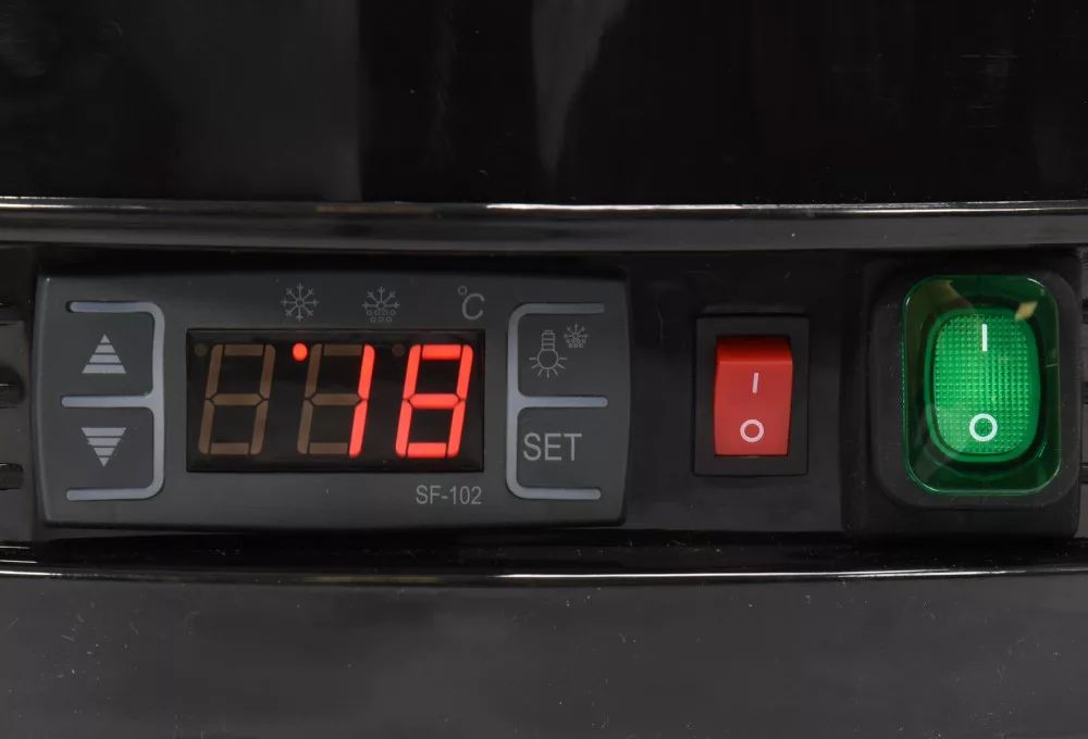 Továbbá, a beépített kétoldali LED világítás nagyon vonzó módon emeli ki a bemutatott ételeket, ezzel ösztönözve a vásárlókat a választásra. A YATO hűtött vitrines pult kapacitása 73 liter és négy krómozott forgó polccal rendelkezik. Ezekhez nyitható üvegajtókon keresztül lehet hozzáférni. Az ajtók, akárcsak a lekerekített szélvédő, dupla edzett üvegből készültek, ami nagy szilárdságot és kiváló szigetelő tulajdonságokat biztosít. Az ablak +2 ~ +12°C hőmérsékleti tartományban működik R600a hűtőközeg használatával. Az alkalmazott kényszerhűtési technológia és az automatikus leolvasztás funkció nagyon hatékony működést biztosít, miközben energiatakarékos. Az éves átlagos energiafogyasztás 1435 kWh. A pultot egy elektronikus vezérlő szabályozza hőmérséklet kijelzővel.