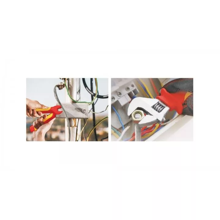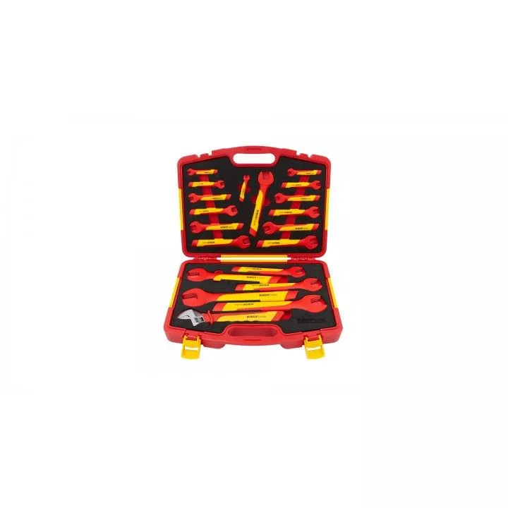 Összetétel: (19x) Nyitott végű: 6mm, 7mm, 8mm, 9mm, 10mm, 11mm, 12mm, 13mm, 14mm, 15mm, 16mm, 17mm, 18mm, 19mm, 21mm, 24mm, 27mm, 30mm, 32mm (1x) Állítható villáskulcs: 10"-os MEGJEGYZÉS: Akár 1000 V-ig feszültség alatt álló alkatrészeken végzett munkákhoz ACNORM: DIN EN 60900 (VDE 0682-201):2019-04