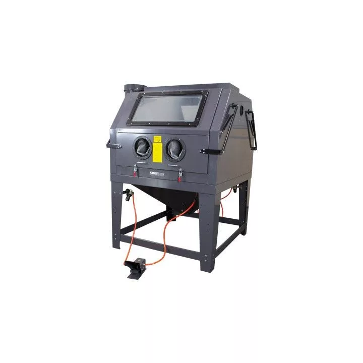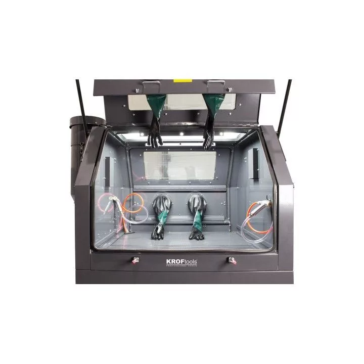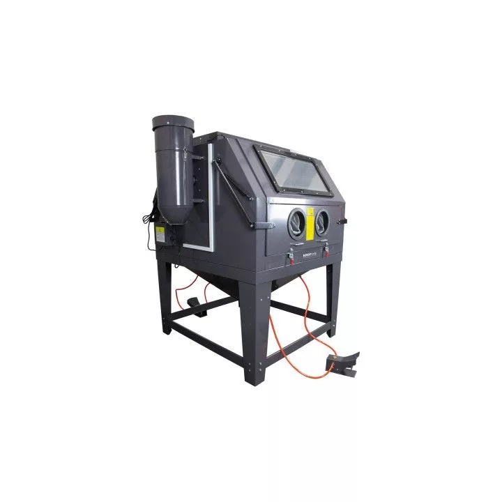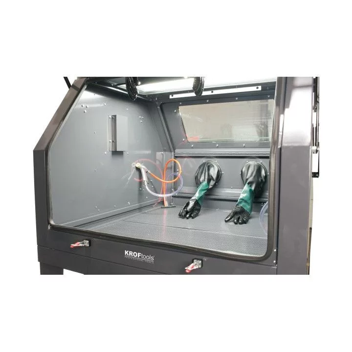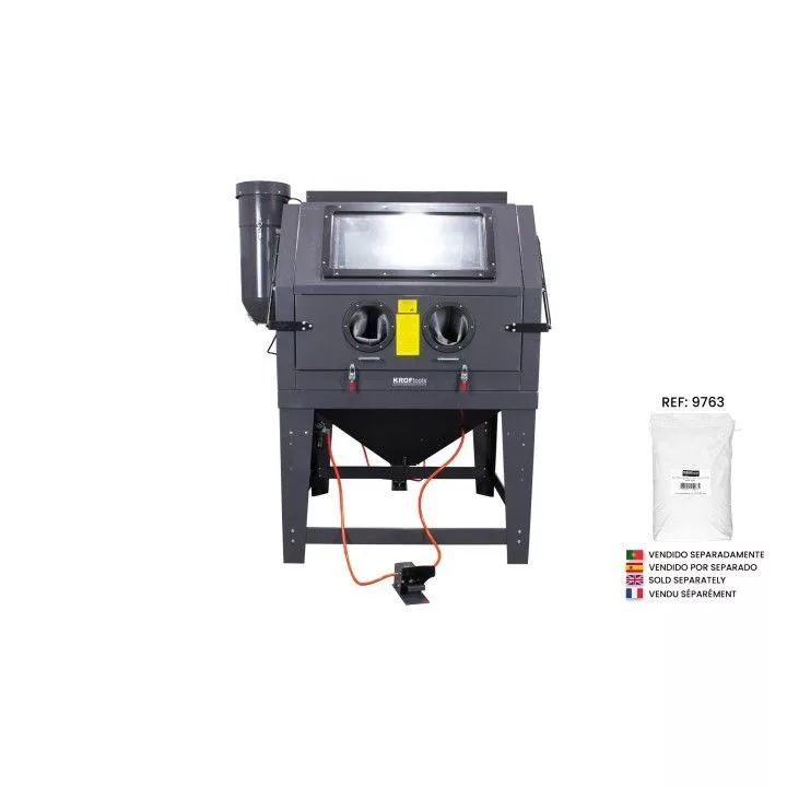 Jellemzők: Teljes méretek: 1524 mm (hosszúság) x 1399 mm (szélesség) x 1839 mm (magasság) Homokterhelés: 32 liter Motor: 220 ~ 240 V 50 Hz 1200 W Alkatrészek száma: maximális teherbírás 60 kg Homok mennyisége: homokterhelés 32 liter (maximum) Munkalámpa: LED lámpa: 3 darab Hossz: 900 mm Teljesítmény: (220~240 V, 50 Hz), 54 W Műszaki adatok: • Masszív acélszerkezet felső fedéllel • Világító ablak üvege 990 * 342 * 5 mm • Kitekintő ablak üvege 730 * 360 * 5 mm • Kitekintő ablak plexiüvege 740 * 360 * 1,5 mm • Fülke alkatrészeinek homokkal történő tisztításához • 200-300 közötti szemcseméretű üvegmikrogömbökkel használható Fúvóka mérete Üzemi nyomás (PSI) Levegőfogyasztás Homok Termelési sebesség (Kg/perc)M3/h L/percΦ6 60 9 150 1,0 kg/perc100 11 183,3 0,8 kg/perc120 12,8 213,3 0,6 kg/percΦ7 60 9 150 1,2 kg/perc100 11 183,3 1,6 kg/perc120 12,8 213,3 1,2 kg/percMEGJEGYZÉS: A homokfúvó kompatibilis a 9772PV cikkszámú védőfóliával, a 9772PL cikkszámú lámpaellenzővel, a 9760-02 cikkszámú kesztyűvel, a 9770-56 cikkszámú porgyűjtővel és a 9773 cikkszámú homokfúvó pisztollyal.