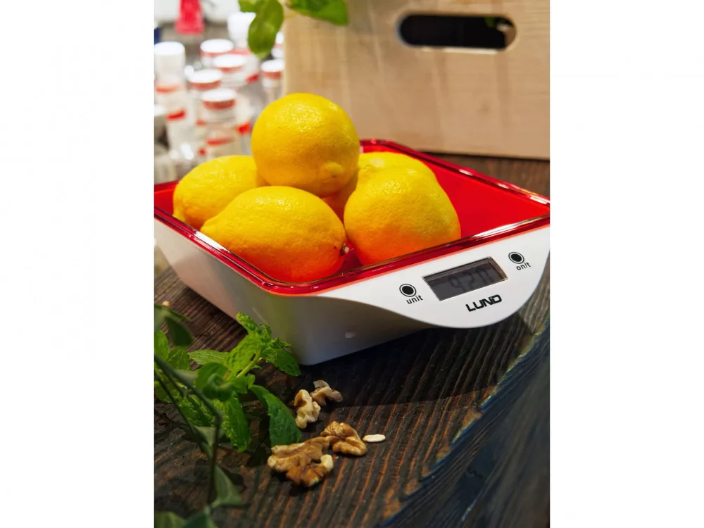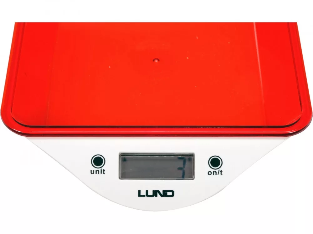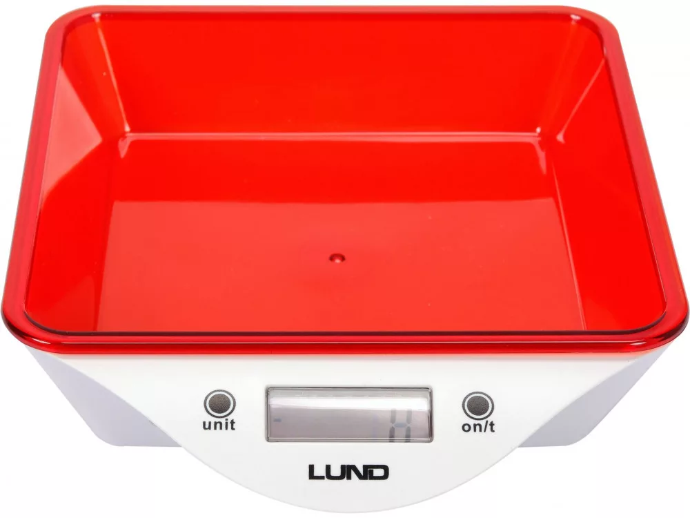 LUND konyhai mérleg 800 ml összkapacitású tállal és 5000 g maximális terhelhetőséggel. Könnyen leolvasható LCD kijelzővel rendelkezik, amelyen 4 súlyegység közül választhat, valamint túlterhelés és alacsony töltöttségi szint jelzővel. További bónuszként a tál kivehető és mosogatógépben mosható.