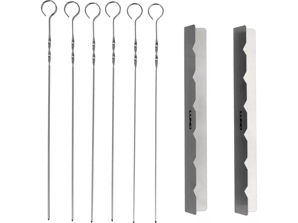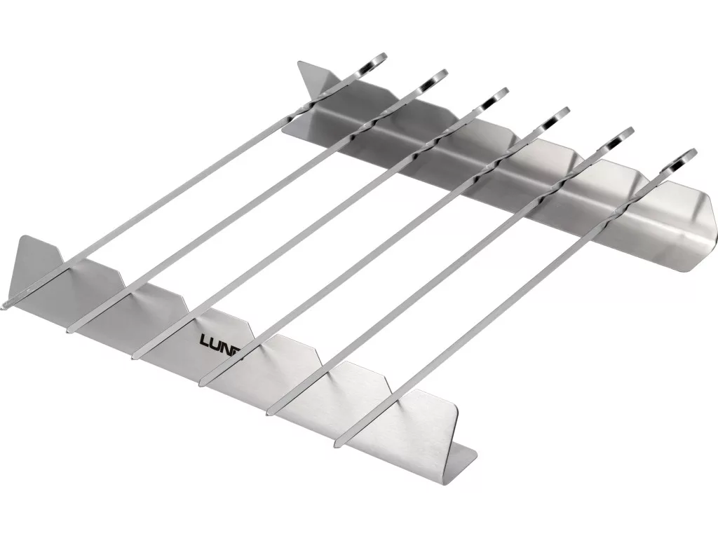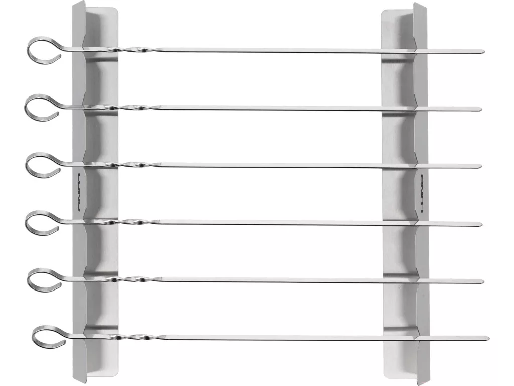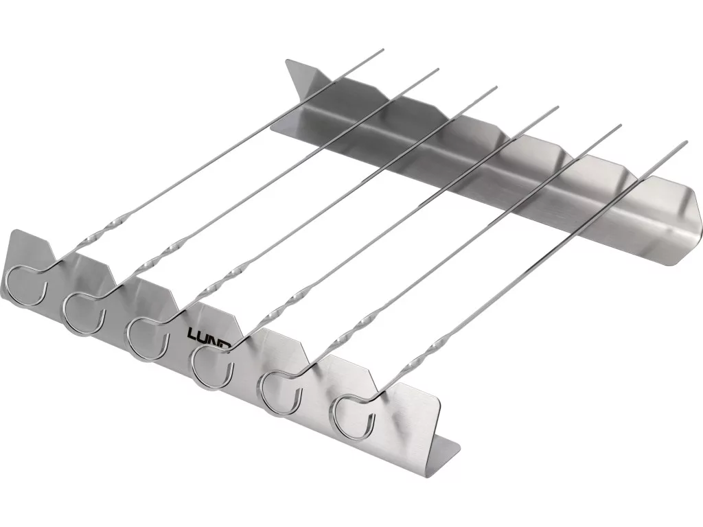 6 darab rozsdamentes acél nyárs tüske stabil alapzattal, amely megkönnyíti az ételek elhelyezését és forgatását.