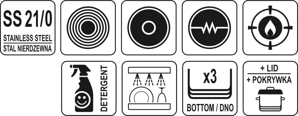 Az alján lévő ferromágneses betét lehetővé teszi a YATO edények használatát bármilyen típusú tűzhelyen, mint például a következőkön