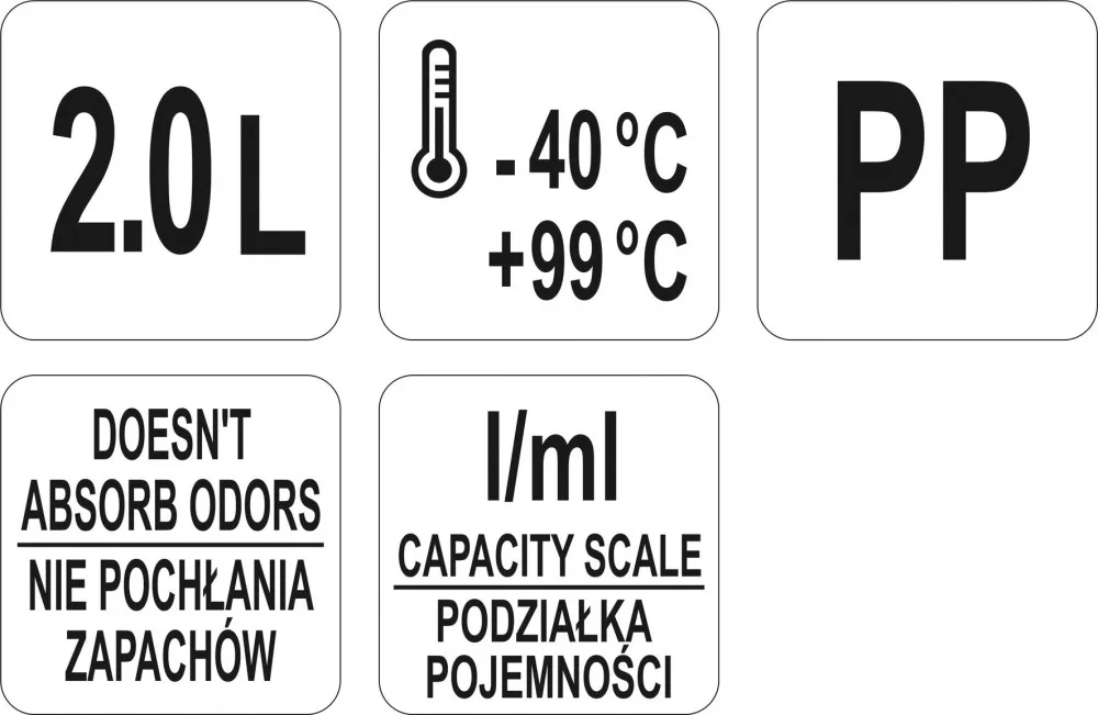 A YATO kancsók rugalmas és tartós polipropilénből készülnek, amely nem szívja magába a szagokat és ízeket. Emellett kényelmes, megerősített fogantyúval rendelkeznek. Ez nagyon praktikussá és sokoldalúvá teszi őket folyékony és szóródó termékek mérésére a -40°C és +99°C közötti hőmérséklet-tartományban.