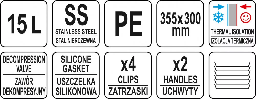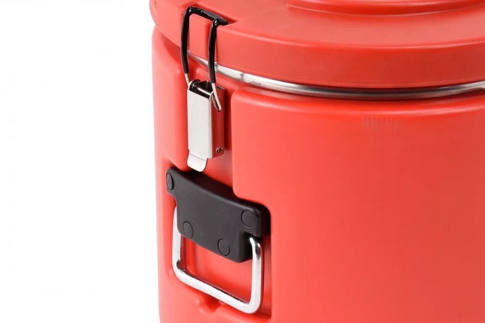 Yato izotermikus ételszállító tartály 15 literes kapacitással. A YATO ételszállító tartályt vendéglátósoknak, szállodásoknak és catering tevékenységet végzőknek ajánlják, kis bankettektől nagy szabadtéri rendezvényekig. A piacon a legjobb ár-érték aránnyal rendelkezik a tulajdonságai és minősége alapján. Kiváló minőségű polietilénből készült, amely ellenáll a karcolásoknak és horpadásoknak, ezáltal védelmet nyújt a sérülések ellen átszállítás és szállítás közben. A tartály belsejében egy beépített, kiváló minőségű rozsdamentes acélból készült tartály található, amely ellenáll a szerves savaknak és könnyen tisztán tartható. A tartály és a falak között egy speciális hőszigetelő réteg helyezkedik el, amely hosszú órákon át megőrzi a hőmérsékletet. Forró tartalom esetén a hőveszteség mindössze 5 °C 4 óra alatt. Hideg tartalom esetén a hőmérséklet-emelkedés csak 3 °C 4 óra alatt. A tartály hőszigetelési teljesítménye a leghatékonyabb termikus ételszállító eszközök élvonalába sorolja. A termosz egy speciális dekompressziós szelepet is használ, amely megkönnyíti a nyitást és kiküszöböli a forró termékek szállítása során a fedél beszívódásának problémáját. A nyomás kiegyenlítése a szelep megnyomásával történik. Emellett a tartályban egy kiváló minőségű szilikonból készült tömítés található, amely megakadályozza a folyékony tartalom szivárgását. Könnyen tisztán tartható a szétszerelési lehetőség és a speciális forma révén, amely megkönnyíti a folyó víz alatti mosást. A hőszigetelő tartály két rozsdamentes acél, masszív fogantyúval van felszerelve, amelyek megkönnyítik a szállítást, és négy reteszes fedélzárral rendelkezik. Ezen elemek magas minősége és szilárdsága garantálja a sokéves problémamentes használatot. A termosz speciális dombornyomásokat használ, amelyek lehetővé teszik a tárolást, azaz az azonos átmérőjű tartályok egymásra helyezését, így viszonylag kis területen lehet őket tárolni.