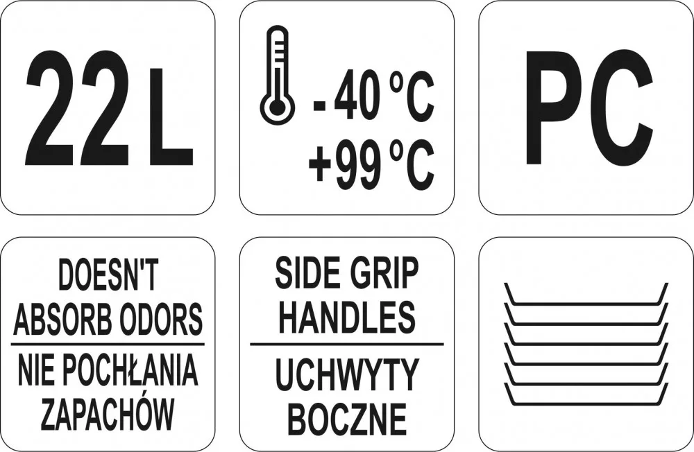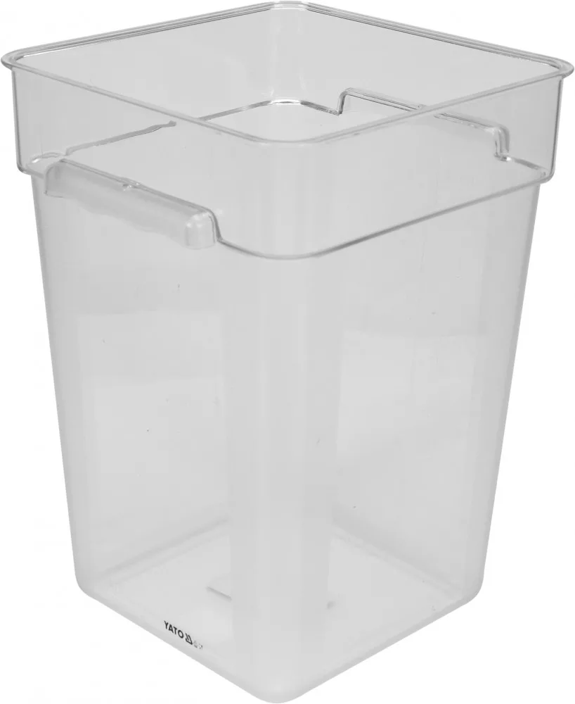 YATO 22 literes négyzet alakú élelmiszertároló tartály. A tartály 22 literes kapacitással rendelkezik, magassága 400 mm, és falainak szélessége 280x280 mm. Nagyon tartós és erős polikarbonátból készült, amely ellenáll a mechanikai sérüléseknek. Az élelmiszerek tárolására tervezték -40 és +99°C közötti hőmérséklet-tartományban. A tartály oldalán literekben és quartokban kifejezett skála található. Ezen kívül az oldalsó fogantyúk megkönnyítik a szállítást. A YATO tartálynak sima belső falai vannak, így nagyon könnyű tisztítani és tisztán tartani. Külső élei különleges bevonattal rendelkeznek, hogy megakadályozzák a karcolódást. A kiváló minőségű anyag nem szívja magába a szagokat vagy ízeket. A speciális dombornyomás lehetővé teszi a tartályok egymásra helyezését. Emellett van egy hely a dátum megírására is.