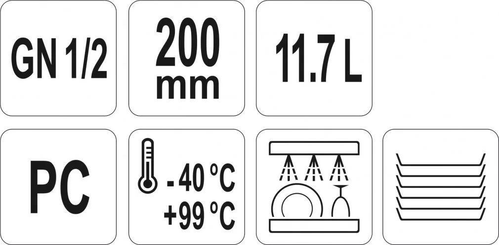 Professzionális GN tartály a YATO-tól, polikarbonátból készült, GN 1/2 200 mm méretekkel és 11,7 l kapacitással.