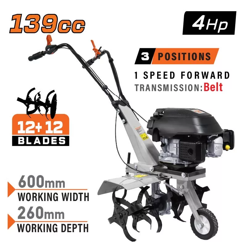 Nagy teljesítményű Nakayama rotációs kapa, amelyet intenzív igénybevételre és nehéz terepviszonyok közötti munkavégzésre terveztek. A robusztus felépítés és a hatékony motor megbízható teljesítményt nyújt a nagyobb igényű szántóföldi vagy kerti feladatok során is.Műszaki adatok:Motor: 139 cm³-es, négyütemű OHV benzinmotorTeljesítmény: 4 LE (Hp)Munkaszélesség: 60 cmVágókések száma: 24 darab (12+12 kapatag)Sebességfokozatok: 1 előremeneti sebességErőátvitel: Tartós szíj- és fogaskerekes hajtóműSúly: 33 kg (nettó)Csomagolási adatok: 35 kg / 69 x 38 x 66 cm