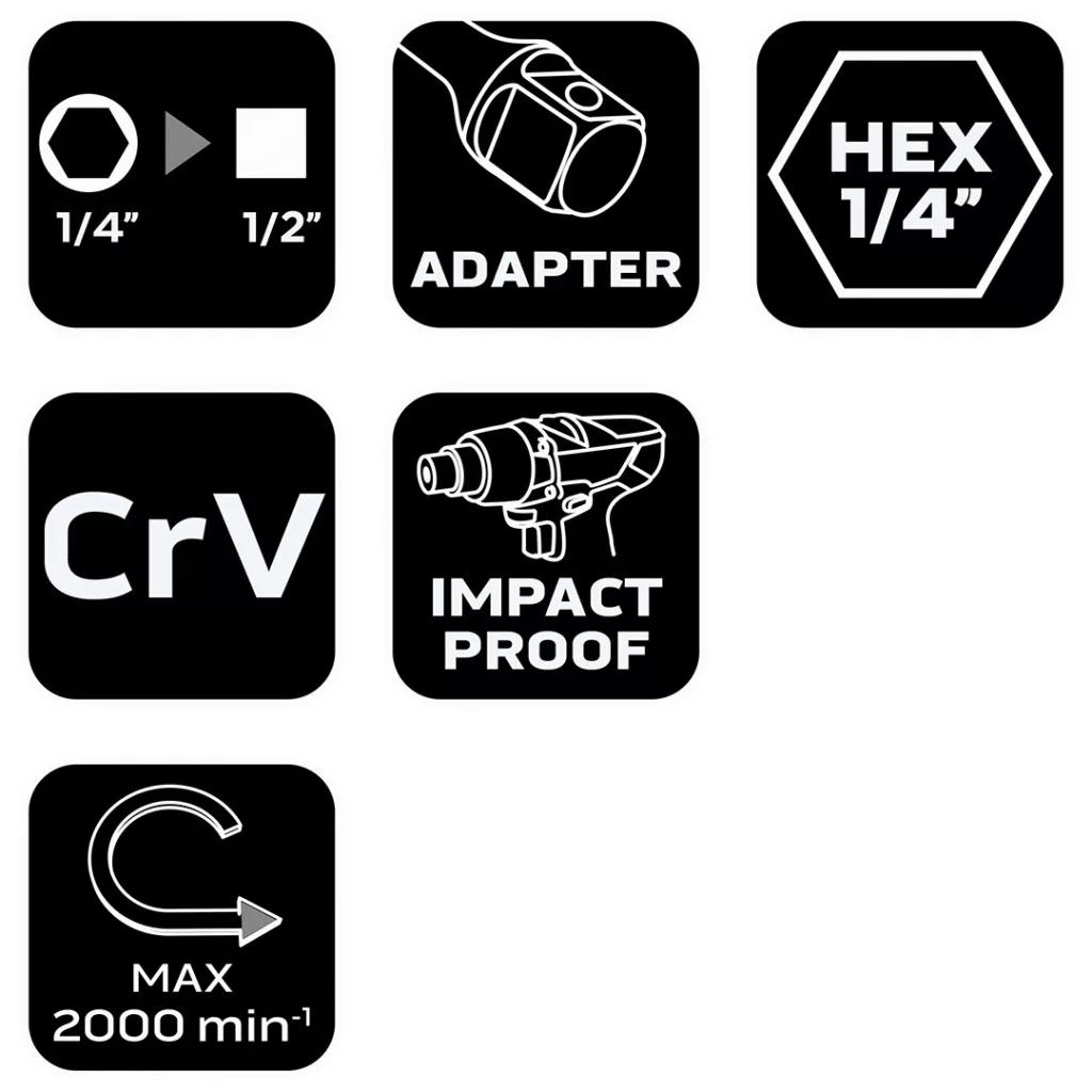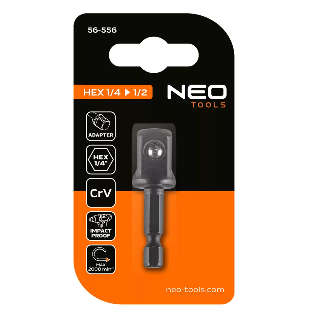 NEO TOOLS Adapter - 1/4" hatlap és 1/2" négyszög (cikkszám: 56-555). Nagy nyomatékú gépekhez, ütvecsavarozókhoz. Kiváló minőségű S2 acélból készül, amelyet fokozott rugalmasság és mechanikai sérülésekkel szembeni ellenállás jellemez. A NEO TOOLS márka a professzionális igényeket kielégítő elektromos szerszámok és tartozékok széles választékát kínálja.