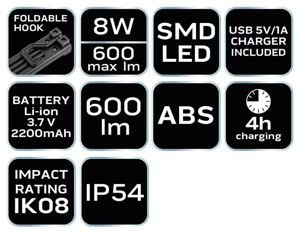 Ez a NEO vezeték nélküli műhelylámpa ideális választás lehet műhelymunkához, sátrazáshoz vagy olyan helyzetekhez, ahol szükség van hordozható és erős fényforrásra. Az akkumulátoros üzemeltetés, a két világítási funkció és a praktikus rögzítési megoldások növelik a lámpa sokoldalúságát. Erős és Hatékony Megvilágítás: Az 8 W-os SMD LED-ek 600 lumen fénykibocsátással biztosítanak erős és hatékony megvilágítást. Akkumulátoros Üzemeltetés: A 3,7 V-os, 2200 mAh kapacitású Li-Ion akkumulátorral a lámpa könnyen hordozható és újratölthető, biztosítva a kényelmet. Két Világítási Funkció: Válassza ki az 100% és 30% világítási funkciókat az adott helyzetnek megfelelően. Az energiahatékony üzemmód hosszabb üzemidőt biztosít. Praktikus Rögzítési Megoldás: A kampó segítségével könnyen rögzítheti a lámpát a kiválasztott helyen, így biztosítva a kényelmes használatot. CE Tanúsítvány: Az európai biztonsági előírásoknak való megfelelést a CE tanúsítvány igazolja, ami garancia a termék minőségére és biztonságára. Fedezze fel a NEO műhlylámpa előnyeit, és élvezze a hatékony és kényelmes megvilágítást!