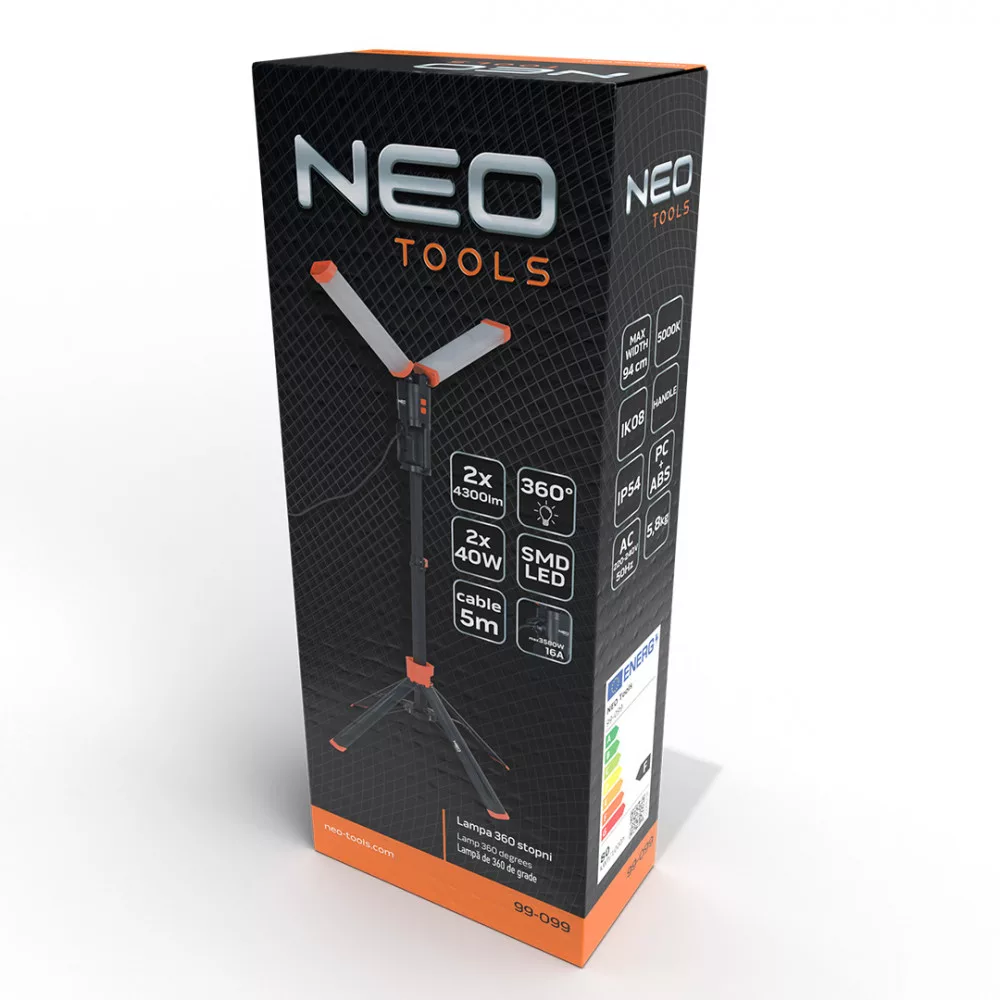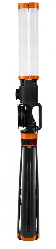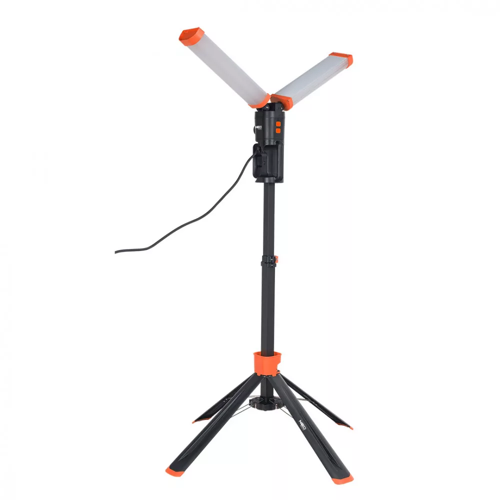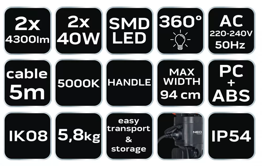 A NEO kettős lámpa számos funkcióval és előnnyel rendelkezik a megfelelő munkaterületeken való hatékony használat érdekében. Néhány kulcsjellemző:Fényforrások: 2 x 4300 lm fényerővel rendelkezik, összesen 8600 lm. A lámpa maximálisan 180 fokos lámpaeloszlással rendelkezik, biztosítva a széles terület megvilágítását.Összecsukható kialakítás: 2 m magasságig és 94 cm szélességig összecsukható, ami könnyű tárolást és szállítást tesz lehetővé.Elektromos csatlakozó: 3580 W 16 A maximális fogyasztású elektromos csatlakozóval van felszerelve.Fényerősség és szín: A 5000 K fényszín intenzív, de nem vakító, így kiváló munkakomfortot biztosít.Tápellátás: 220-240 V 50 Hz-es váltakozó áramú tápegységgel rendelkezik., Kényelmes szállítás: 5 m-es kábellel, hordozófogantyúval és mágnesekkel a lámpatestben és a lámpákban a könnyű szállítás érdekében.Építés és anyag: A lámpatest ABS-ből készült, IP54 vízállósági besorolással és IK08-es esés- és törésállósággal rendelkezik, így alkalmas kültéri és belső felhasználásra is.Súly: A lámpa könnyű súlyú, mindössze 5,8 kg, ami tovább növeli a hordozhatóságát.A NEO kettős lámpa kiváló választás barkácsolók, építkezők és más szakemberek számára, akiknek széles területet kell megvilágítaniuk a munkájuk során.