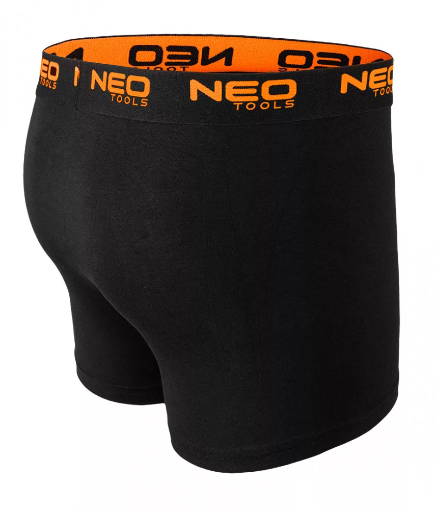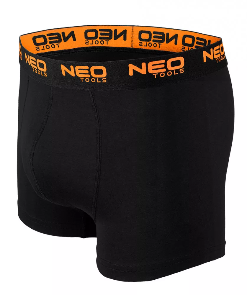 Basic boxeralsó, 3 darab, L méret 81-679-L a NEO TOOLS-tól egy három darabos férfi boxeralsó szett, három színváltozatban (sima fekete, fekete, foltos nyomtatással a lábszáron és fekete, fehér és narancssárga szerszámmintával nyomtatott fekete). Egyszínű trikóból készült 95% pamut és 5% elasztán. Súlyuk 180 g/m2. Puha jacquard gumival és narancssárga logóval ellátott. Lapos elülső panelvarrással, egy extra panellel az ágyékban és oldalsó varrás nélkül. A sima kidolgozású lábak szintén hozzájárulnak a kényelemhez. Az alsónemű belső oldalán méretcímke található az összetételi és ápolási utasításokkal. A boxeralsó egy ablakkal ellátott kartondobozba van csomagolva. A ruhadarab a NEO TOOLS saját márkájú dizájnjához tartozik. Eredeti ajándékként ajánlott férfinapra, Valentin-napra vagy bármilyen más alkalomra.