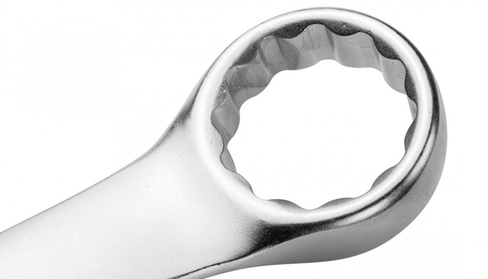 Csillag-villáskulcs, CrV acél, DIN 3113, présminta, szatén felületkikészítés, polírozott, 15°-ban hajlított fej