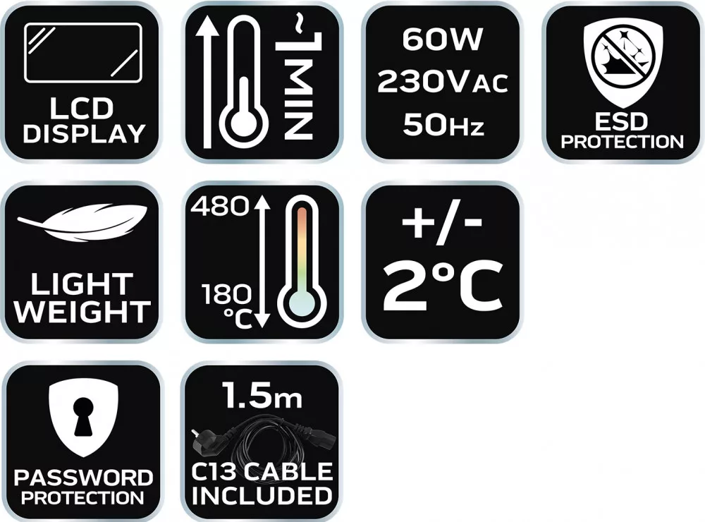A NEO 60 W, 180 - 480 °C 19-200 forrasztóállomás 60 W-os teljesítményű, 180 - 480 °C közötti hőmérséklet-szabályozással és +/- 2 °C pontossággal rendelkezik. LCD kijelzővel és jelszavas védelemmel van felszerelve a könnyű használat érdekében. A statikus feltöltődés elleni ESD-védelem és az automatikus kikapcsolási funkció hozzájárul a biztonságos használathoz. Az állomásnak csak rövid időre - kevesebb mint 1 percre - van szüksége a felmelegedéshez, hogy használatra kész legyen. Praktikus állvánnyal kínáljuk.