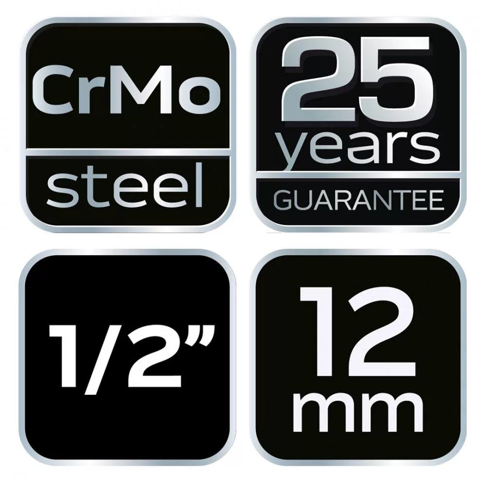 1/2" hosszú gépi dugókulcs, 12 mm, CrMo acél