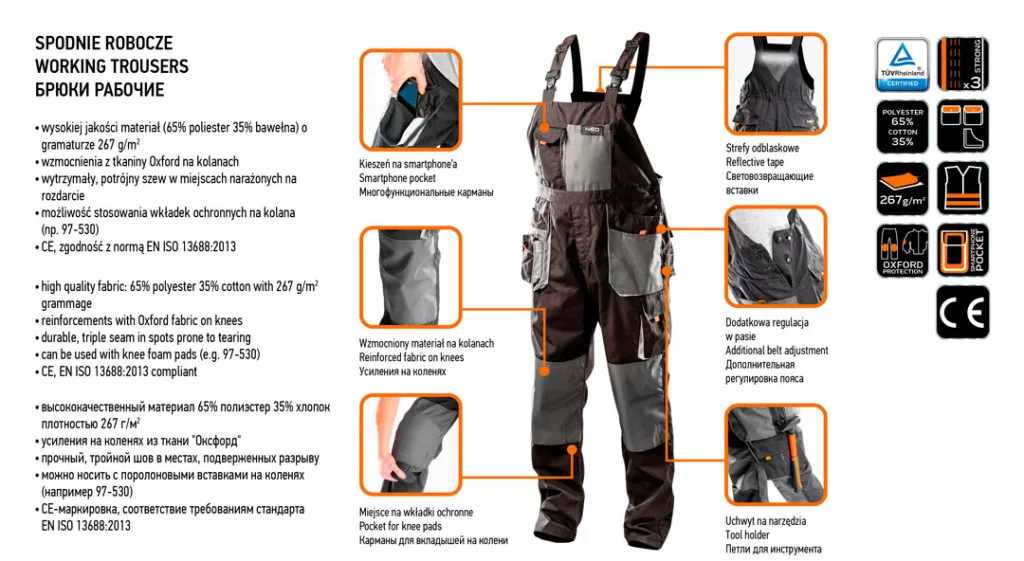 A NEO kantáros munkanadrág kiváló minőségű anyagból készül, a kopásnak kitett helyeken meg van erősítve. A tartósságot tripla varrások növelik és van rajta térdvédőknek kialakított zseb is. A szolid zsebekben elférnek a szükséges szerszámok.A kantárnak köszönhetően még a nagy terhelés sem okoz kényelmetlenséget munka közben. Megtalálható rajta egy okostelefonnak kialakított zseb is,ahol a nagyobb kijelzős modellek is elférnek. A termék EN ISO 13688:2013 szabvány szerinti kivitelezése és a CE európai tanúsítványa minőségének garanciája. A NEO márka a professzionális igényeket is kielégíti.