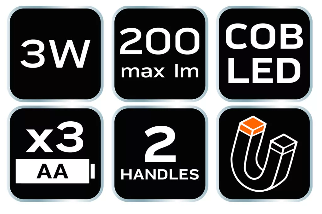 Ismerje meg a NEO elemes kempinglámpa sokoldalúságát és praktikus tervezését, ami ideálissá teszi minden kempingezéshez és szabadtéri tevékenységhez. Ez a 3 az 1-ben termék egyszerre lámpaként, zseblámpaként és figyelmeztető fényként is használható, így minden szituációra felkészült. Az oldalsó és a felső fogantyúk lehetővé teszik a könnyű szállítást és felakasztást, növelve a lámpa funkcionalitását. A 3 az 1-ben funkcióknak köszönhetően kiálasztható a megfelelő világítási mód az aktuális igényeknek megfelelően - zseblámpa, lámpa vagy figyelmeztető fény. A lámpa 200 lumen fényáramú és 3 W teljesítményű COB LED-ekkel van felszerelve, biztosítva a kiváló fényerőt és hatékonyságot. A lámpa talapzatában elhelyezett mágnesek lehetővé teszik a könnyű rögzítést fémfelületeken, míg a kihúzható szerkezet lehetővé teszi a lámpa állásának szabályozását. lámpa 3 db AA elemmel működik (nem tartozék), így nincs szükség töltésre, és könnyen cserélheti az elemeket szükség esetén. Ez a NEO elemes kempinglámpa tökéletes társ minden szabadtéri kalandhoz. Praktikus tervezése és kiváló minőségű LED-ek biztosítják, hogy mindig megbízható fényforrásra számíthasson bármilyen kempingezés vagy szabadtéri tevékenység