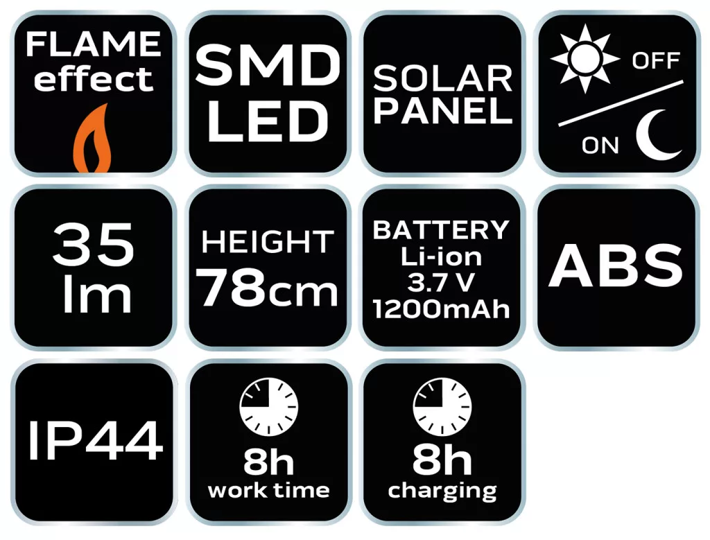 Ismerje meg a NEO napelemes kerti lámpa jellemzőit, amelyek tökéletesek lehetnek a kertek, teraszok vagy egyéb kültéri területek hangulatos megvilágításához. Lánghatású Világítás: A 1 W-os SMD LED-ek lánghatást biztosítanak, hangulatos és kellemes megvilágítást teremtve. 35 Lumen Fényáram: A 35 lumen fényáram elegendő ahhoz, hogy körülölelje a területet, kényelmes és dekoratív megvilágítást nyújtva. Napelemes Töltés: A lámpát a mellékelt 3,7 V-os, 1200 mAh kapacitású Li-Ion akkumulátor táplálja, amelyet a napfény tölt a beépített napelem segítségével. Szürkületérzékelő: A lámpa szürkületérzékelővel van felszerelve, ami automatikusan aktiválja a lámpát, amikor elégtelen fényt érzékel, így nem szükséges manuálisan bekapcsolni. Európai Biztonsági Megfelelés: A CE tanúsítvány igazolja, hogy a termék megfelel az európai biztonsági előírásoknak. Ez a NEO napelemes kerti lámpa kiváló választás lehet a kertek hangulatos megvilágításához. A lánghatás és a napelemes működés egyaránt hozzájárul a kellemes és energiatakarékos környezethez. Fedezze fel a NEO lámpa előnyeit, és élvezze a dekoratív megvilágítást a szabadban!