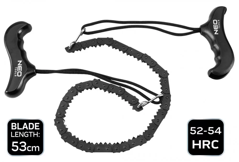A NEO kézi láncfűrész, 53 cm 63-158 egy olyan szerszám, amely 52-52 HRC keménységű mangánacél pengével rendelkezik. ABS nyéllel rendelkezik. A szerszám öntisztító és kétirányú fogakkal van felfegyverezve. A zsebformára összehajtható kialakítás lehetővé teszi a könnyű tárolást a mellékelt nejlon hordtáskában. A NEO márkát a túlélés szerelmeseinek ajánljuk.