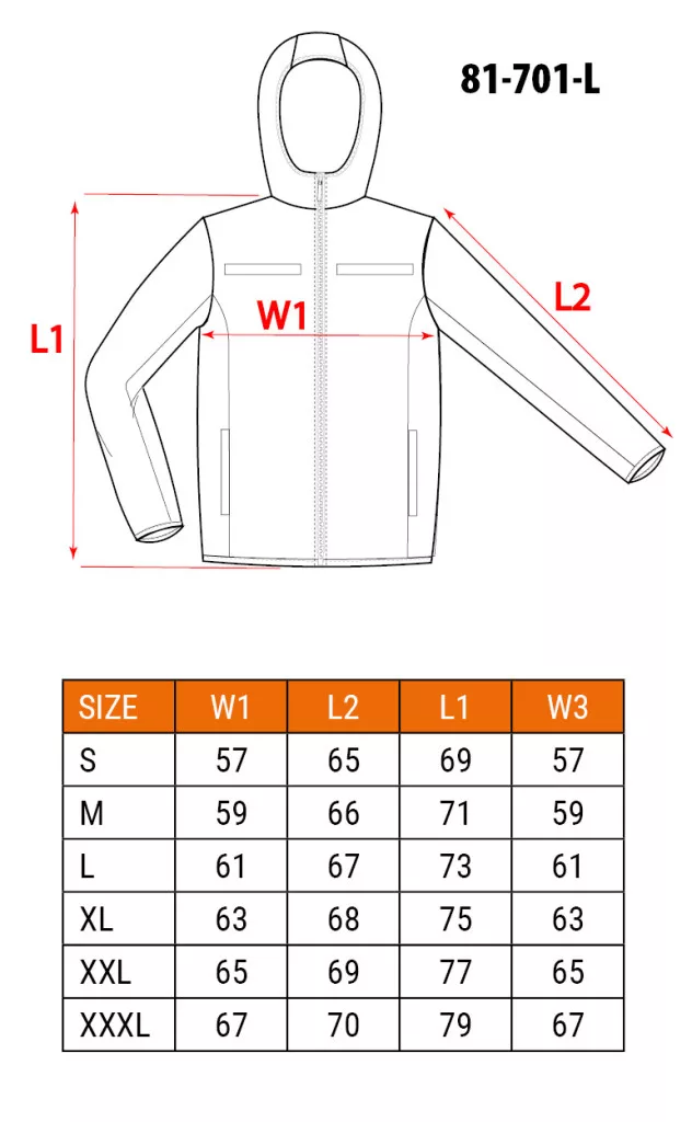 Munkadzseki, softshell láthatósági dzseki kapucnival, narancssárga színű, mérete L, láthatóság: 2. osztály az EN ISO 20471 szabvány szerint, vízállósága 8000 mm, légáteresztő képesség 3000 g/m2/24h, szélálló, polár bélés, 4 cipzározható zseb, külső tépőzáras zseb, tépőzáras összehúzó az ujjakban, szabályozható összehúzó a derékban, legombolható kapucni összehúzóval, CE tanúsítvány, EN ISO 13688:2013