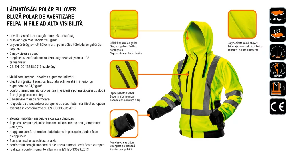 Munkadzseki, Láthatósági, citromsárga, mérete L, Intenzív láthatóságú, EN ISO 20471 szabvány szerinti 3 osztály, 100% poliészter, 240 g/m2, polár bélés, kétrétegű kapucni és gallér, összehúzó zsinór az ujjakban és derékban, 3 zippzáras zseb, sötét anyagok a szennyeződéseknek leginkább kitett helyeken, CE tanúsítvány, EN ISO 13688:2013