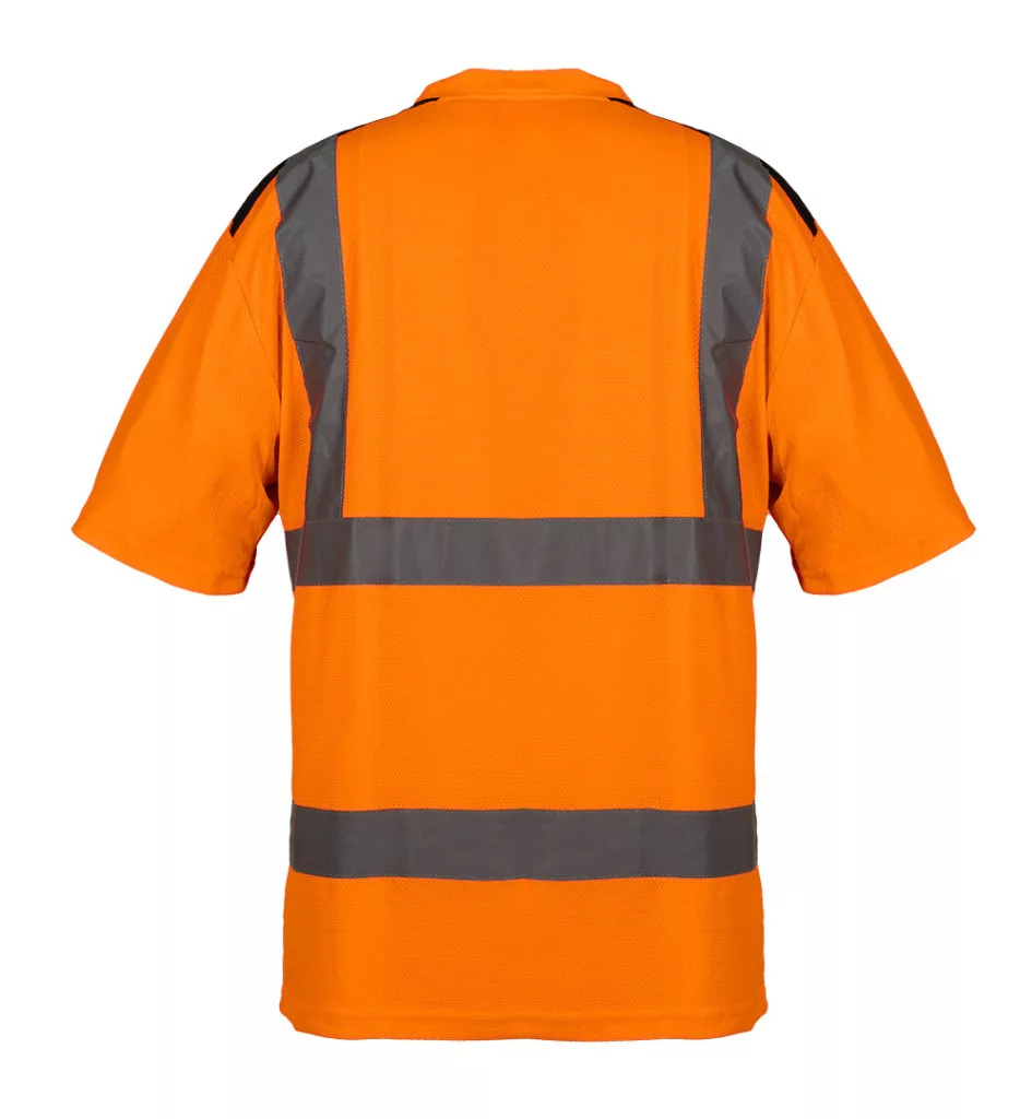 Munkapóló, láthatóság, sötét alj, narancssárga színű, mérete L, Intenzív láthatóságú, EN ISO 20471 szabvány szerinti 2 osztály, 100% poliészter, 150 g/m2, hálós szerkezetű anyag, könnyű és szellős, sötét anyagok a szennyeződéseknek leginkább kitett helyeken, CE tanúsítvány, EN ISO 13688:2013