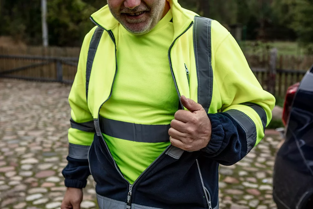 Munkapóló, láthatóság, sötét alj, sárga színű, mérete L, Intenzív láthatóságú, EN ISO 20471 szabvány szerinti 2 osztály, 100% poliészter, 150 g/m2, hálós szerkezetű anyag, könnyű és szellős, sötét anyagok a szennyeződéseknek leginkább kitett helyeken, CE tanúsítvány, EN ISO 13688:2013