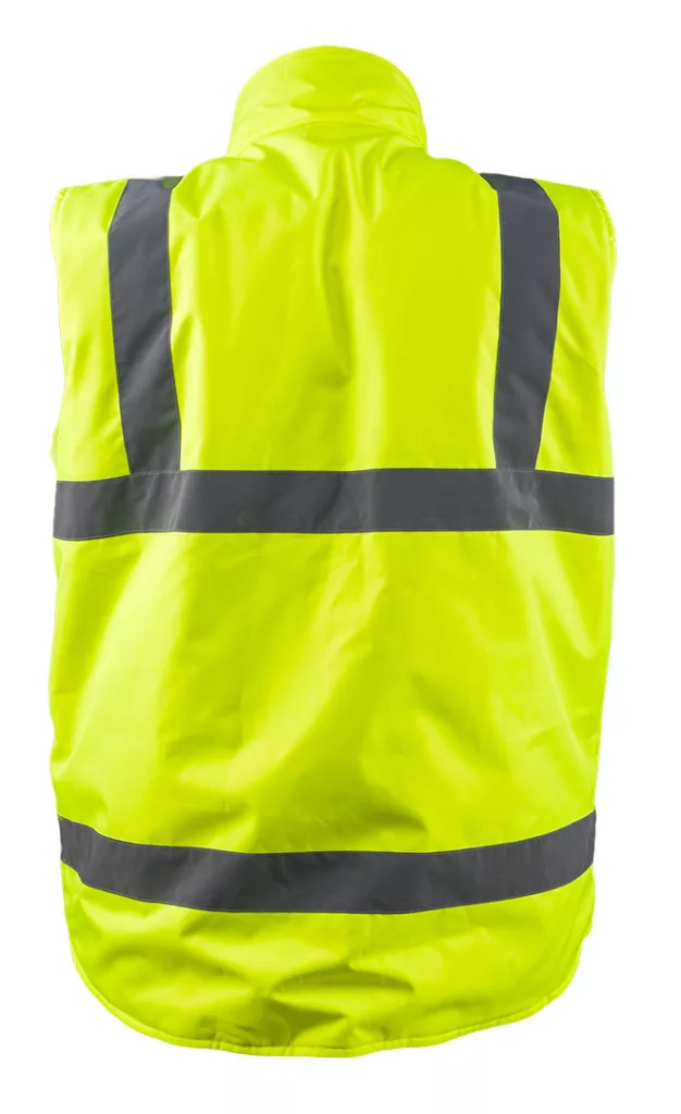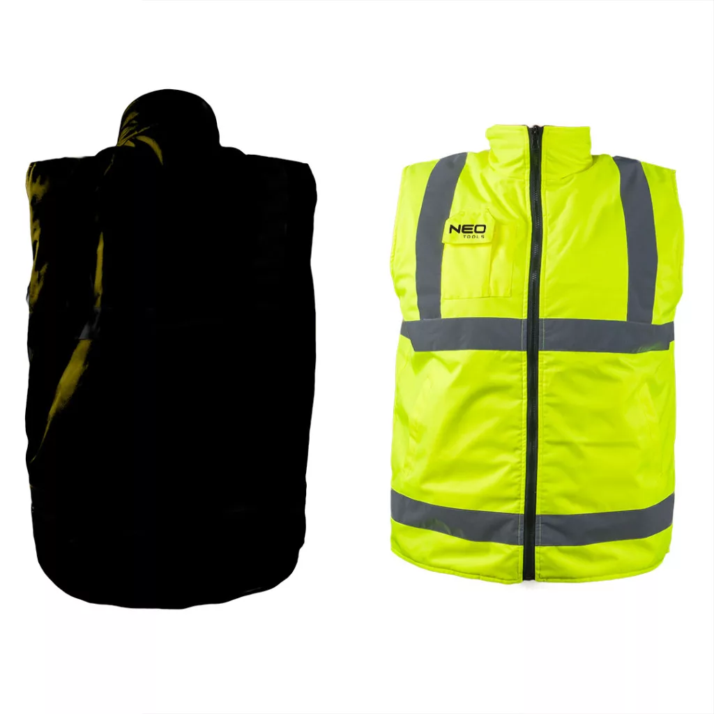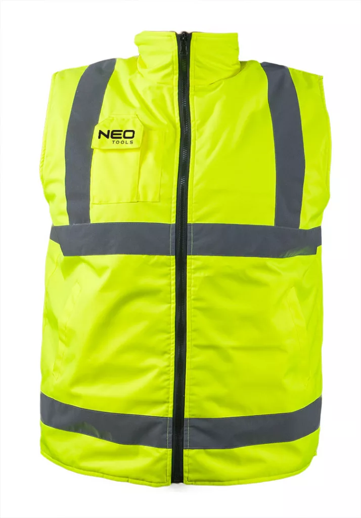 A NEO fényvisszaverő munkamellény erős láthatóságú, kétoldalat bélelt.Használójának biztonságát nappal és éjszaka is bizosítja. A mellény külső oldala tartós, vízálló, fluoreszkáló anyagból, fényvisszaverő elemekkel készült, a PN-EN ISO 20471:2013 szabvány szerint láthatósága a 2. osztályba sorolt. A belső oldala fekete polárból készül, a magas gallér és a meghosszabbított hátsó rész biztosítja a meleget és a kényelmet viselője számára a hűvös napokon. A mellény jobb oldalán van kialakítva zseb okostelefonnak és tollnak.A mellény sokoldalúságát értékelni fogják a gépkocsivezetők, az építőiparban dolgozók, de minden más használó is. A termék európai CE tanúsítványa minőségének garanciája. A NEO márka a professzionális igényeket is kielégíti.