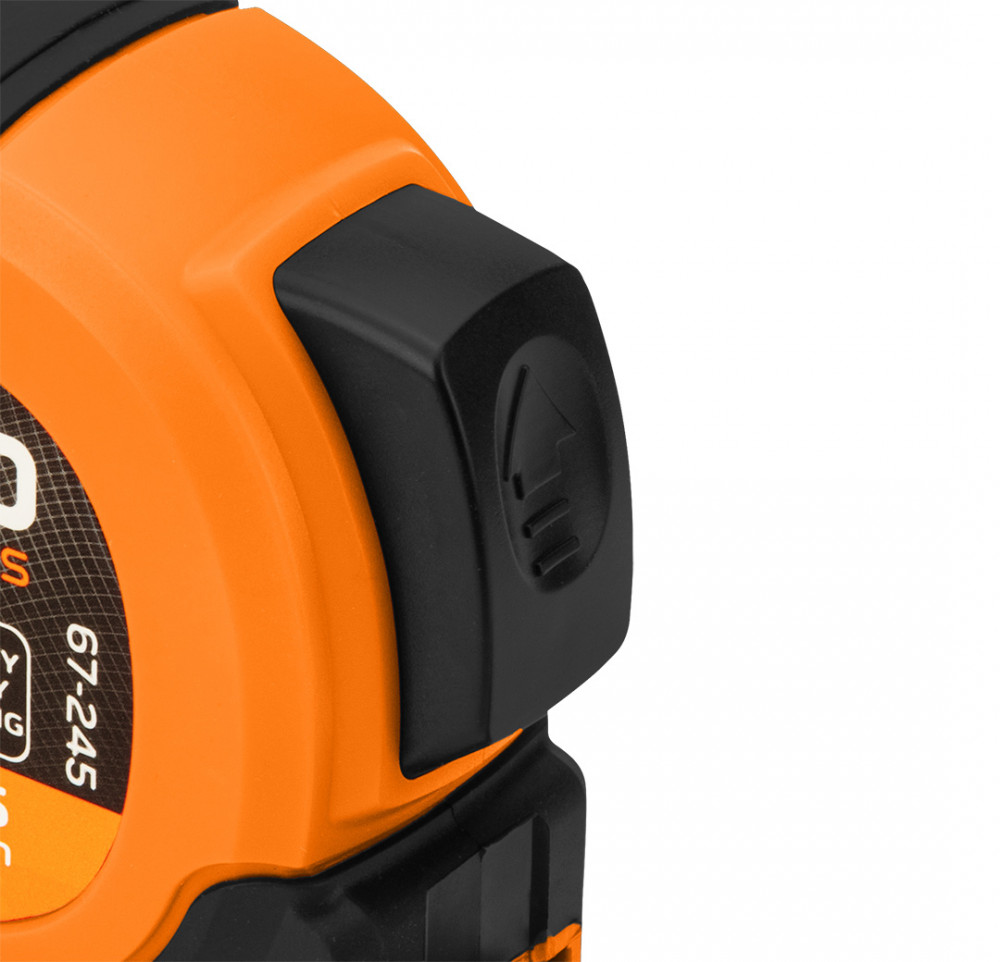NEO Mérőszalag, 10m/25mm, erősített rugós, acél, fekete szalag fehér nagyított skálával, mágneses, autostop+rögzítő (67-245)