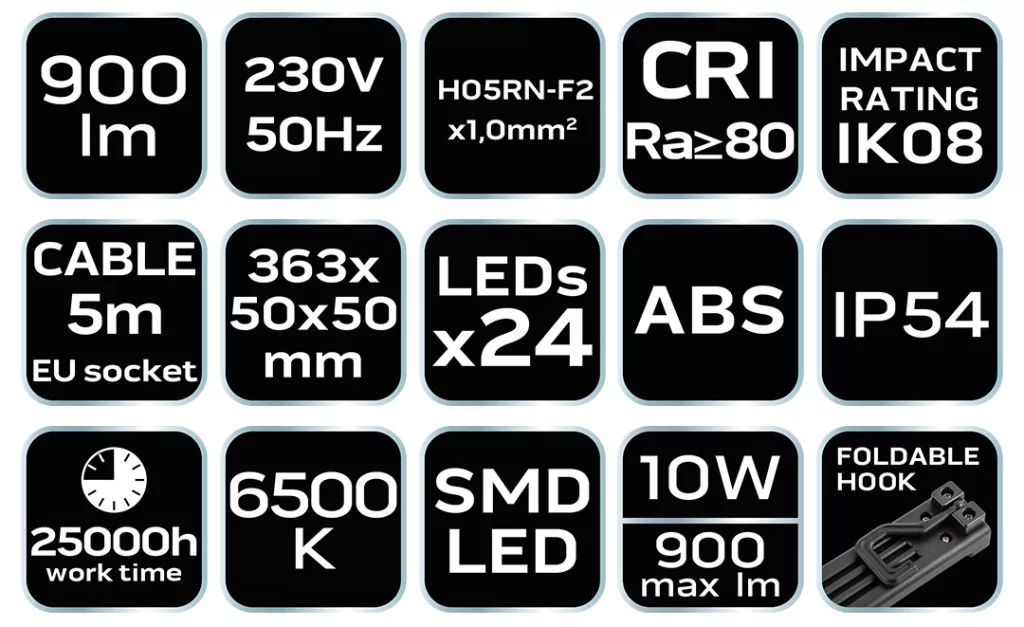 Ez a NEO műhelylámpa ideális választás lehet műhelymunkához, szereléshez vagy olyan helyzetekhez, ahol szükség van erős és nagy területet lefedő megvilágításra. A kampó, a hosszú tápkábel és a magas fényteljesítmény növelik a lámpa sokoldalúságát. Erős és Hatékony Megvilágítás: A 10 W-os SMD LED-ek 900 lumen fénykibocsátással biztosítanak erős és hatékony megvilágítást. Praktikus Rögzítési Megoldás: A kampó segítségével könnyen rögzítheti a lámpát a kiválasztott helyen, biztosítva a kényelmes használatot. Hosszú Tápkábel: A 5 méter hosszú tápkábel lehetővé teszi a rugalmas elhelyezést és a lámpa távolabb lévő aljzatokhoz történő csatlakoztatását. , CE Tanúsítvány: Az európai biztonsági előírásoknak való megfelelést a CE tanúsítvány igazolja, ami garancia a termék minőségére és biztonságára.