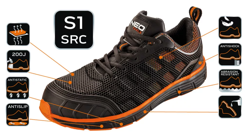 Munkacipő, félcipő, szövet, méret 44, csúszásmentes talp rezgéselnyelő rendszerrel, dörzs-, olaj-, benzin- és szerves oldószerálló, max. 200 J energiájú ütésnek ellenálló acél orrmerevítő, antisztatikus betét, S1 SRC kategóriájú, SRC bevonat CE tanúsítvány