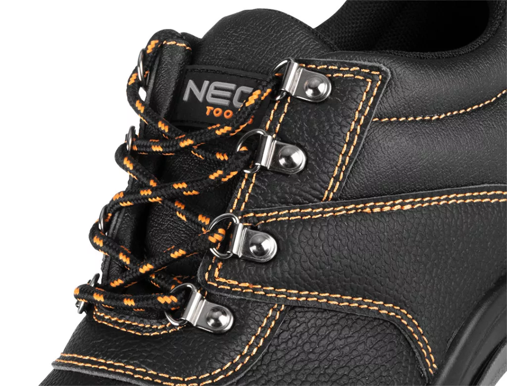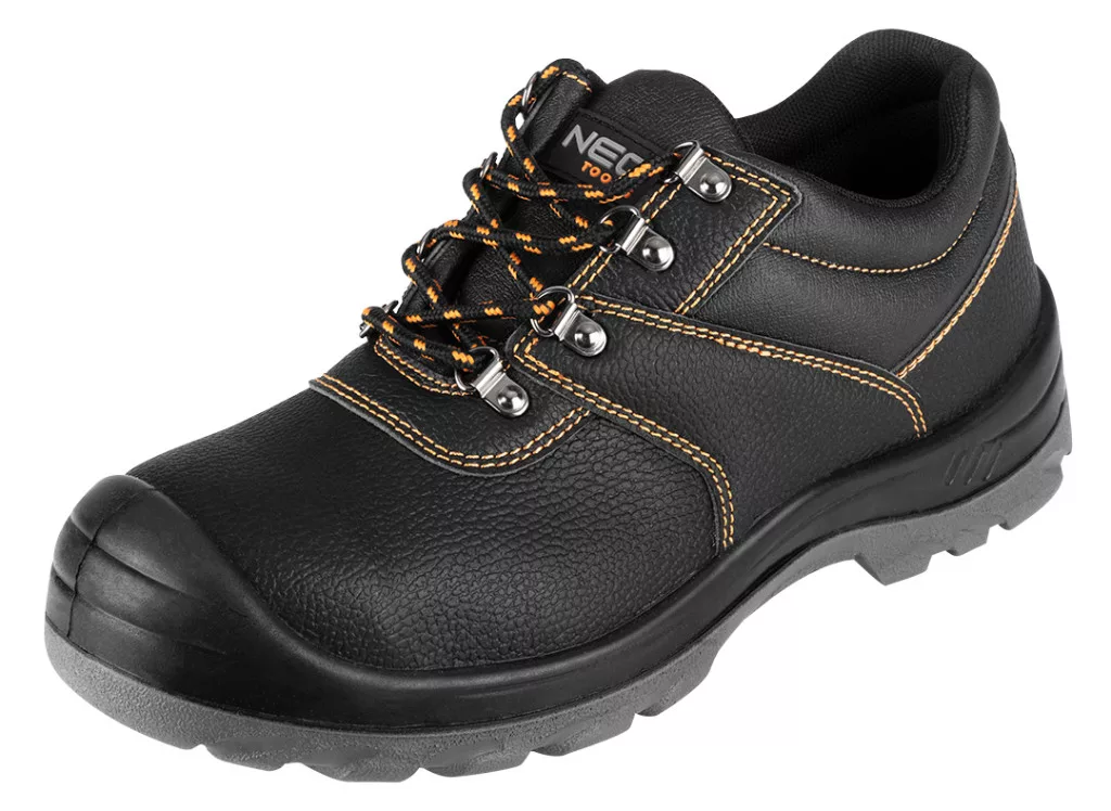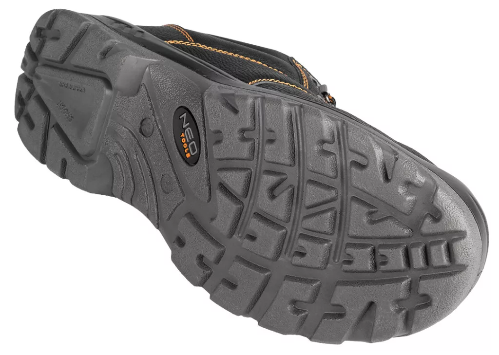 NEO 82-164-39 Munkavédelmi cipő, S3 SR FO, acélbetéttel. Többcélú biztonsági lábbeli. A dombornyomott hasított bőrből készült bőr felsőrésznek és a beépített sarokvédőnek köszönhetően kényelmet biztosít a hosszú távú munkavégzés során. A 200J ütési energiájú ütések ellen védő acél lábfejvédő és az acél talpátszúrásgátló betét biztonságot nyújt a felhasználóknak. A NEO TOOLS cipő kétkomponensű anyagból készült PU/PU talpa biztosítja az olajokkal, benzinnel és más szerves oldószerekkel szembeni ellenállást, valamint a glicerinnel bevont kerámialapokon való csúszásállóságot. A félcipőkre jellemzőek továbbá az antielektrosztatikus tulajdonságok, a sarokrész energiaelnyelése vagy a szivárgással és átázással szembeni ellenállás megnövelt paraméterei. Az EN ISO 20345 szabvány szerint biztonsági lábbeliként vannak besorolva. A NEO TOOLS márkájú munkacipőt a szakemberek és a barkácsolás szerelmesei számára ajánljuk.