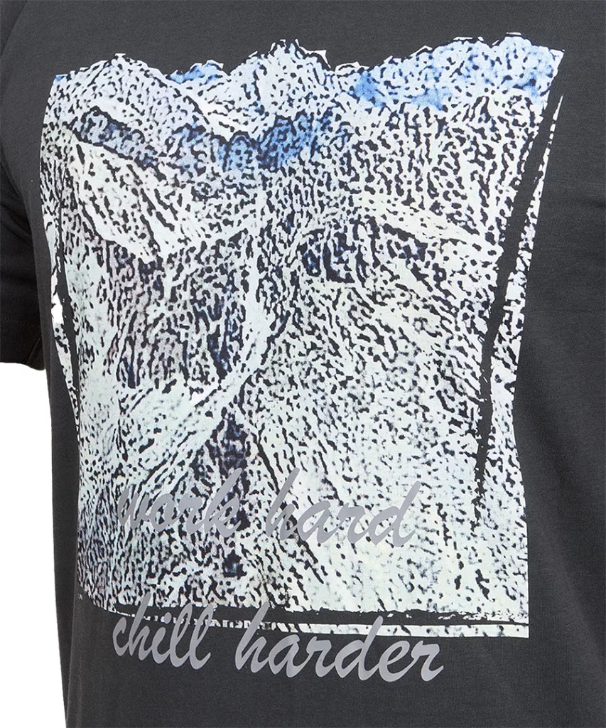 NEO 81-645 Munkavédelmi póló, OUTDOOR, hegyek, fekete, 100% pamut, 180g/m2. Egy kényelmes, rövid ujjú póló, amelyet fekete szín és nyomtatott minta jellemez. A fotónyomtatott grafika hegyek pixeles körvonalait és a ,,work hard - chill harder" feliratot ábrázolja. A póló 100% puha pamutból készült. Súlya 180 g/m2 . Raglan ujjak és kerek nyakkivágás elasztikus szalaggal biztosítja a kényelmes viseletet. A nyakszirtre nyomtatott logó és a névtábla hangsúlyozza a részletekre való odafigyelést. A NEO TOOLS póló egyedi, saját tervezésű, a lehető legjobb minőséget kínálja a mindennapi viselethez.