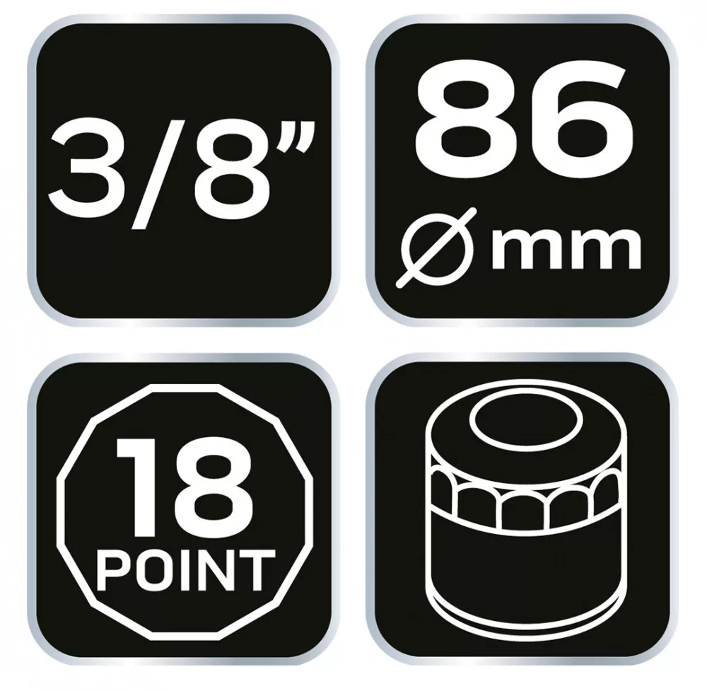 NEO olajszűrő kulcs. A 86 mm átmérőjű 18 szögű szűrőkhöz illeszkedik. A kulcsnyílás , 3/8" (10 mm). Számos márka autójához illeszkedik. A kulcs acéllemezből készült, feketére festve.