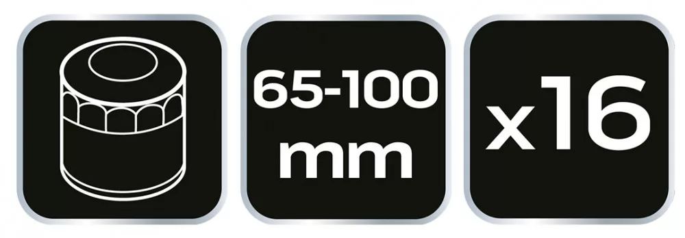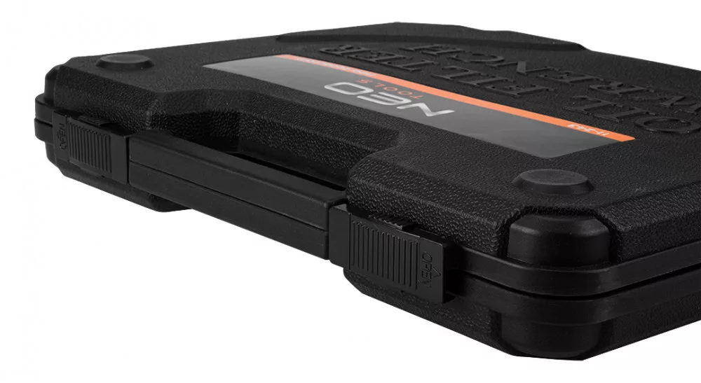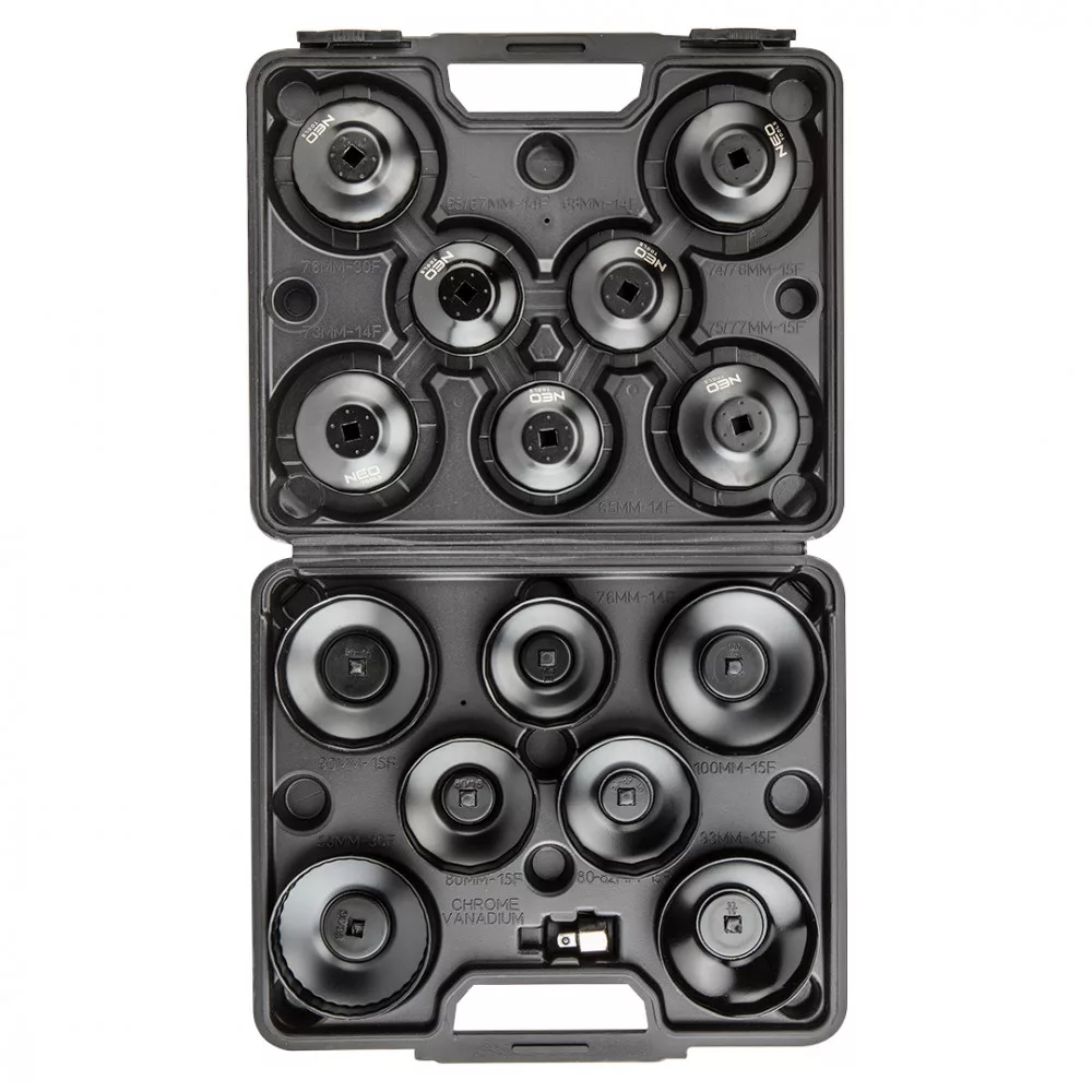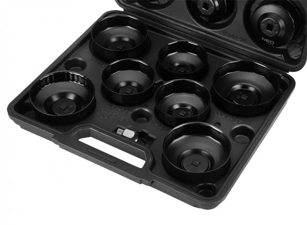 NEO 11-243 Olajszűrő dugókulcs készlet, 16 db-os. Professzionális műhelyek és autószervizek, valamint haladó amatőrök számára. Kehely szerkezetű dugókulcs-készlet. Az autók fém olajszűrőinek szerelésére szolgál. A kulcsok mellett a készlet tartalmaz egy 3/8" - 1/2" adaptert is. A készlet egy speciális kofferben található, ahol mindennek nevesített helye van, megkönnyítendő a rendtartást és a keresett dugókulcs megtalálását.A,