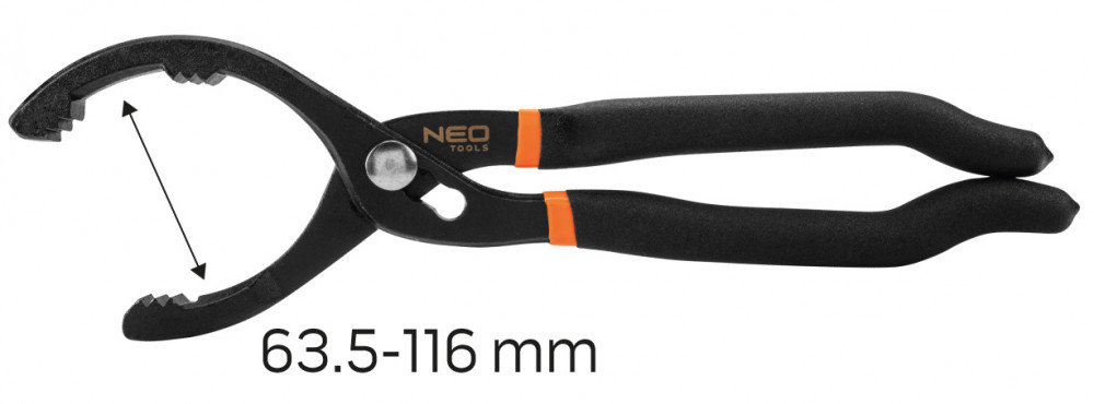 NEO olajszűrő fogó, hajlított csúcsú (20°). Olajszűrőkhöz professzionális autószervizek számára, valamint haladó amatőrök számára. A kulcsot a fémházas külső olajszűrők hatékony és helyes beszereléséhez tervezték. Alkalmas 63,5 és 116 mm közötti átmérőjű szűrőkhöz.