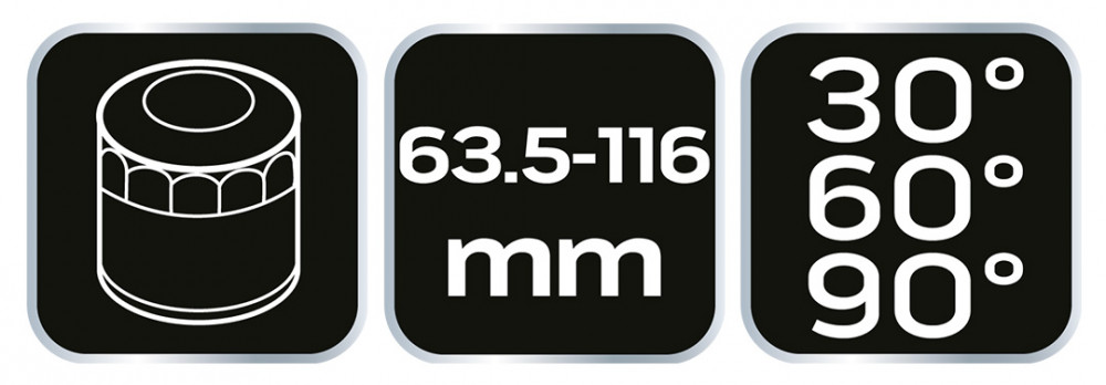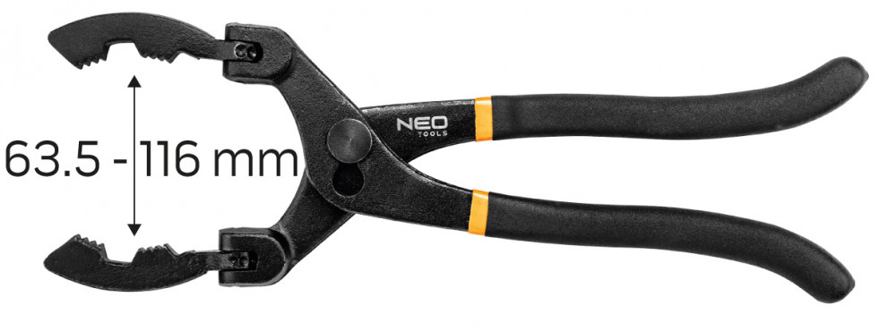 NEO olajszűrő fogó, hajlított csúcsú (30°/ 60/ 90). Olajszűrőkhöz professzionális autószervizek számára, valamint haladó amatőrök számára. A kulcsot a fémházas külső olajszűrők hatékony és helyes beszereléséhez tervezték. Alkalmas 63,5 és 116 mm közötti átmérőjű szűrőkhöz.