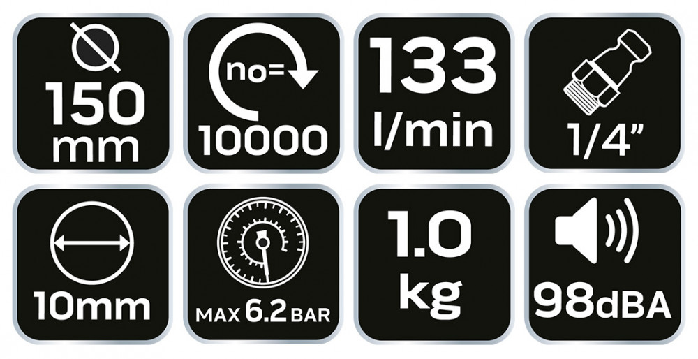 Pneumatikus excentercsiszoló 150 mm, 10 000 perc-1, excentrikus mozgás 5 mm, üzemi nyomás 6,3 – 7,0 bar, átlagos levegőigény 45 l/perc, porelszívó rendszer, tépőzáras papírrögzítés, tömeg 1.0 kg, CE