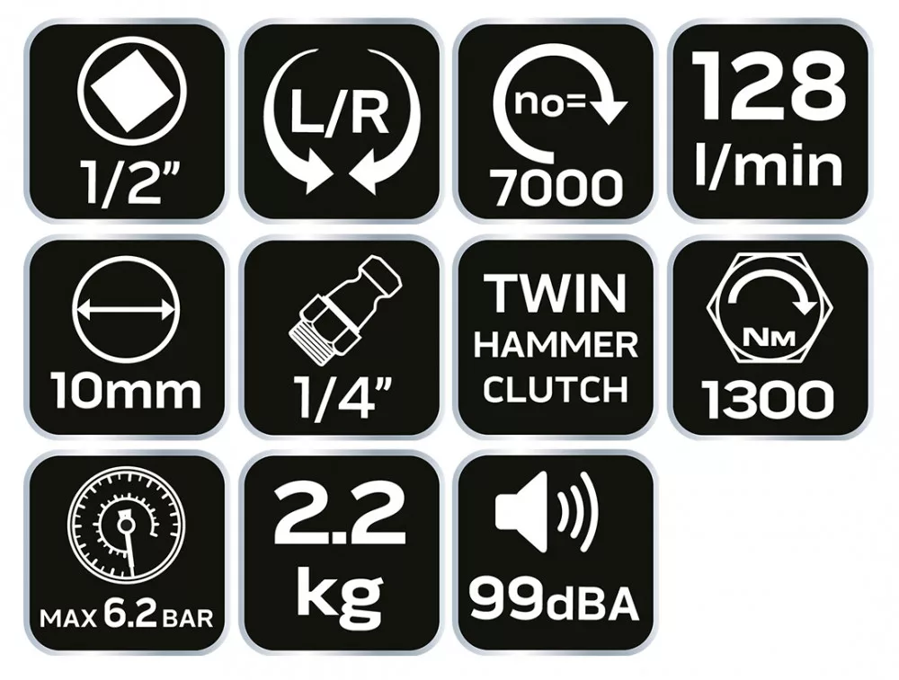 Pneumatikus ütvecsavarozó, 1/2", 1300 Nm, üzemi nyomás: 6.3-7.0 bar, átlagos levegőigény: 128 l/perc, 7000 perc-1 (±10%), kettős, kalapácsos ütőrendszer (twin hammer), tömeg 2,2 kg, CE