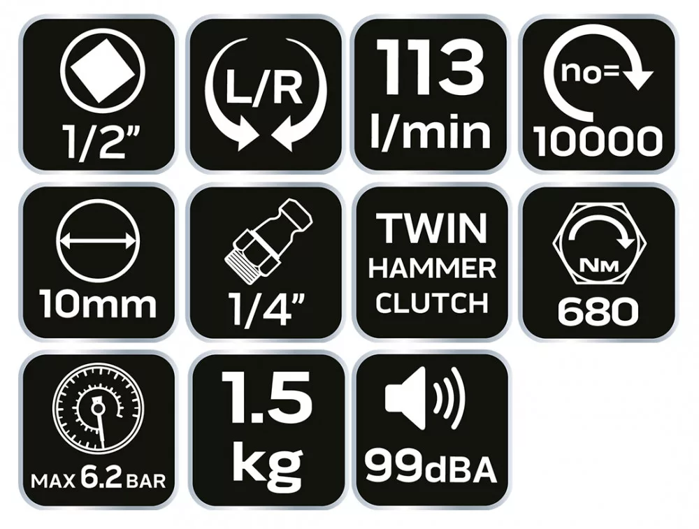 Pneumatikus ütvecsavarozó, 1/2", 680 Nm, üzemi nyomás: 6,3 - 7,0 bar, átlagos levegőigény: 113 l/perc, 10 000 perc-1 (±10%), kettős, kalapácsos ütőrendszer (twin hammer), tömeg 1.50 kg, CE