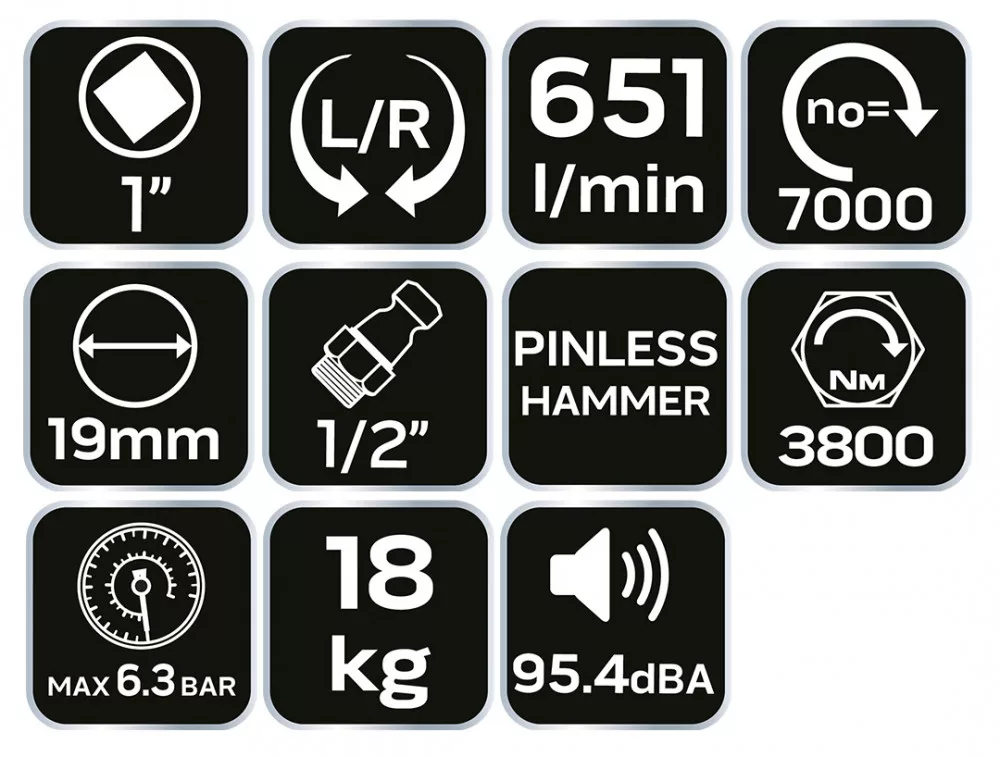 NEO professzionális pneumatikus ütvecsavarozó, 1"-os. Nagyon erős terheléssel járó munkákhoz. Pinless kalapácsos ütőmechanizmus maximális forgatónyomaték elérését teszi lehetővé széles fordulatszám-tartományban. Hosszú kihajtótengely és pótmarkolat jellemzi. Forgásirányváltás jobb-bal, forgatónyomaték-szabályzás 3800 Nm tartományban. A CE tanúsítvány igazolja az európai biztonsági normáknak való megfelelést. A NEO márka a professzionális igényeket is kielégíti.