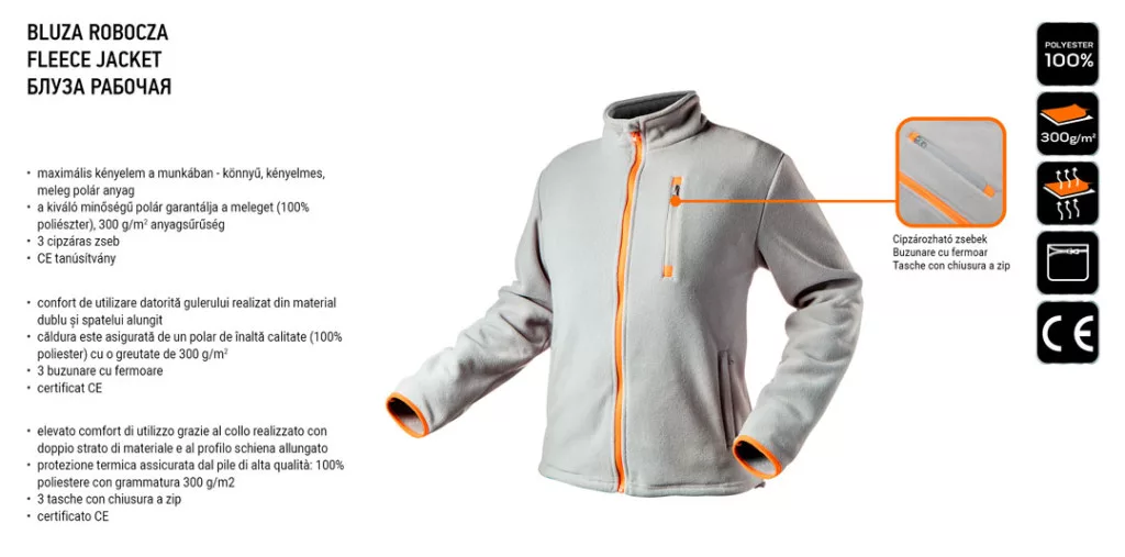 NEO polár munkadzseki könnyű,kényelmes és meleg, komfortot biztosít az alacsonyabb hömérsékleteken végzett munkák során. A pulóvernek három nagy zippzáras zsebe van. A termék DIN 13688:2013 szabvány szerinti kivitelezése és az európai tanúsítványa minőségének garanciája. A CE tanúsítvány igazolja az európai biztonsági normáknak való megfelelést. A NEO márka a professzionális igényeket is kielégíti.