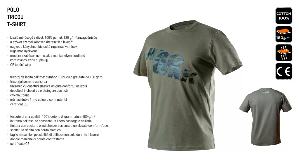 NEO munkapóló, CAMO termékcsalád része. Katonai mintázattal nyomtatott, olívazöld színű. A termék kiváló minőségű, pamut szövetből készül. A divatos szabása lehetővé teszi a termék munka utáni viselését. A CE európai tanúsítványa garantálja minőségét. A NEO márka a professzionális igényeket is kielégíti. S-XXL méretben kapható.