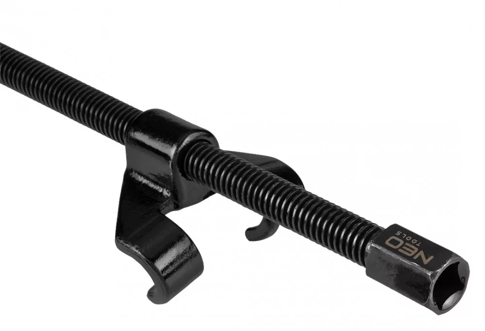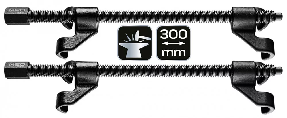 NEO 300 mm hosszú kovácsolt rugóösszenyomók. A készletben két összenyomó található, az összes rugótípus szereléséhez, pl. a McPherson-felfüggesztés esetében is. A lehúzókhoz 1/2"-os hajtókar használható, négy rögzítési pontjuk van, és massziv menet a biztonságos munka érdekében nagy terhelés mellett is. A termék kiváló minőségét és megbízhatóságát bizonyítja a TÜV Rheinland tanúsítvány. A NEO márka a professzionális igényeket is kielégíti.
