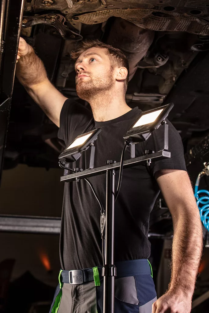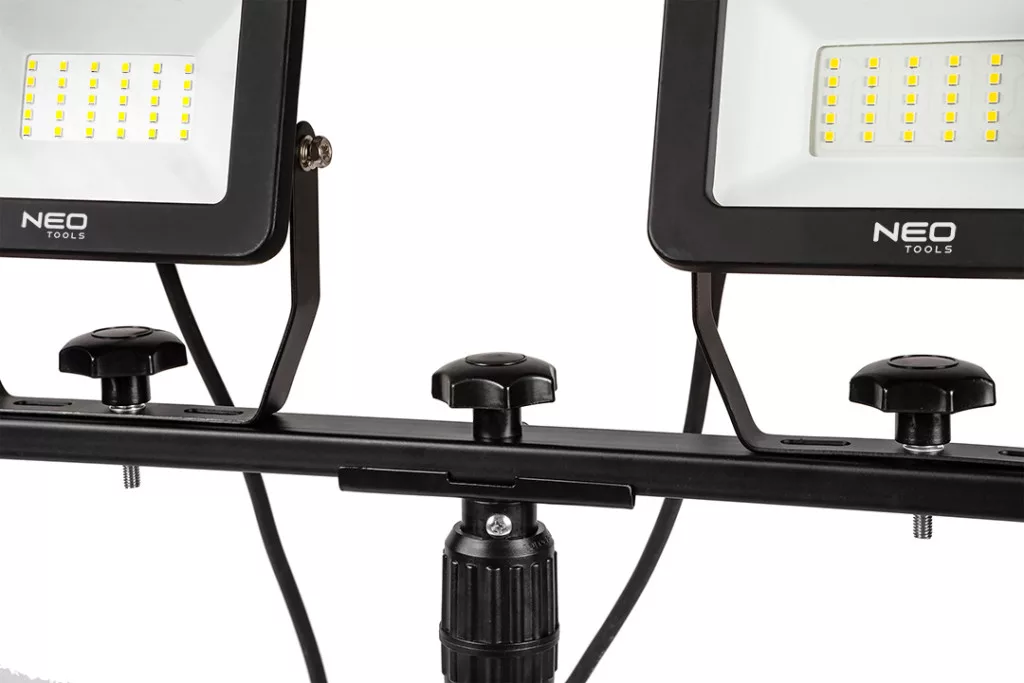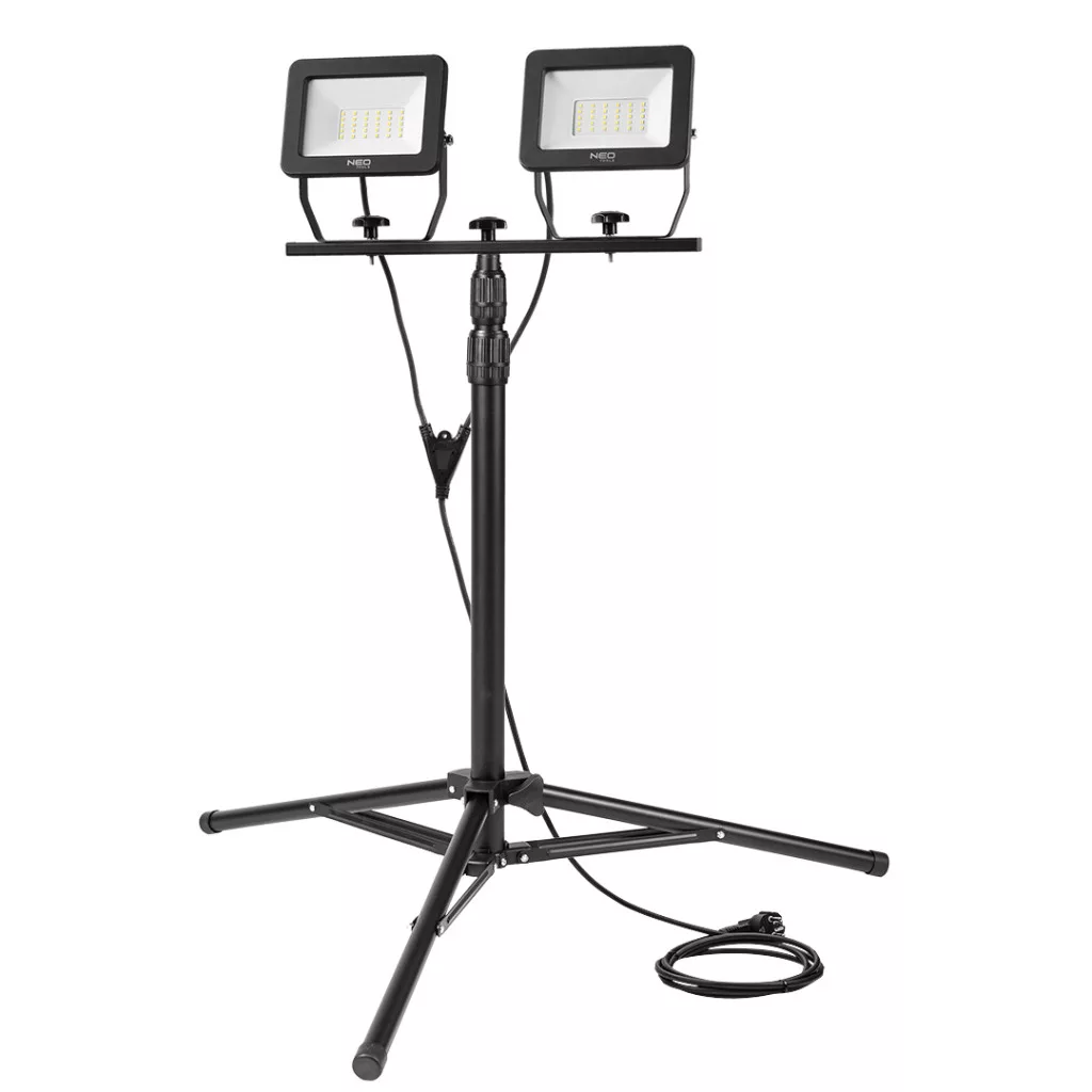Ismerje meg a NEO Állványos Kettős Reflektor jellemzőit. 2 x 50 W-os SMD LED-ek: Két erőteljes, 50 W-os SMD LED biztosítja a magas fényteljesítményt és hatékony megvilágítást. 9000 Lumen Fényáram: A kettős reflektor 9000 lumen fényárammal rendelkezik, így ideális a javítási, építési vagy műhelyi munkákhoz. Állványra Helyezett Világítótest: Az állvány stabil alapot biztosít, miközben a világítótest magassága és iránya szabadon állítható. Maximális Magasság 1,8 m: Az állvány maximális magassága 1,8 méter, lehetővé téve a magasabb megvilágítást és a széles látóteret. , Alumínium Test: A reflektor testét alumíniumból készítették, amely könnyűséget és tartósságot biztosít. IP65 Védelmi Besorolás: Az IP65 védettségi besorolásnak köszönhetően a reflektor kültéri használatra is alkalmas, ellenállva az időjárási viszontagságoknak. Európai Biztonsági Megfelelés: A CE tanúsítvány igazolja, hogy a termék megfelel az európai biztonsági előírásoknak. A NEO állványos kettős reflektor kiváló választás lehet olyan helyeken, ahol erős és széles körű megvilágításra van szükség. Két nagy teljesítményű LED biztosítja a hatékony világítást, míg az állítható magasság és irány lehetővé teszi a fény pontos beállítását. Ideális a javítási és építési munkákhoz, valamint műhelyi vagy fotóstúdiókhoz.